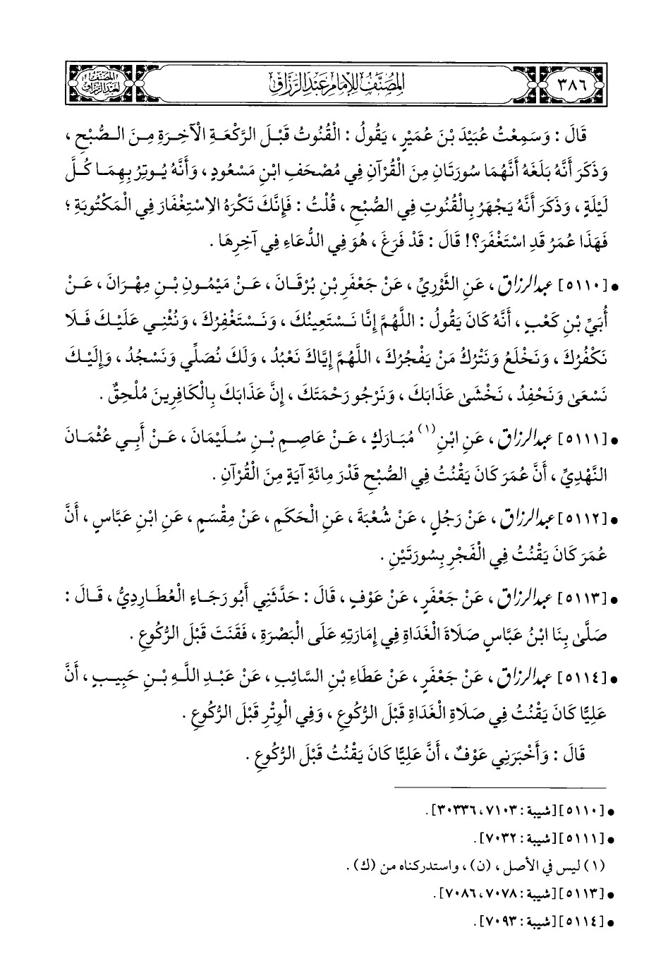 • [٥١١١] عبد الرزاق، عَنِ ابْنِ (¬١) مُبَارَكٍ، عَنْ عَاصِمِ بْنِ سُلَيْمَانَ، عَنْ أَبِي عُثْمَانَ النَّهْدِيَّ، أَنَّ عُمَرَ كَانَ يَقْنُتُ فِي الصُّبْحِ قَدْرَ مِائَةِ آيَةٍ مِنَ الْقُرْآنِ.