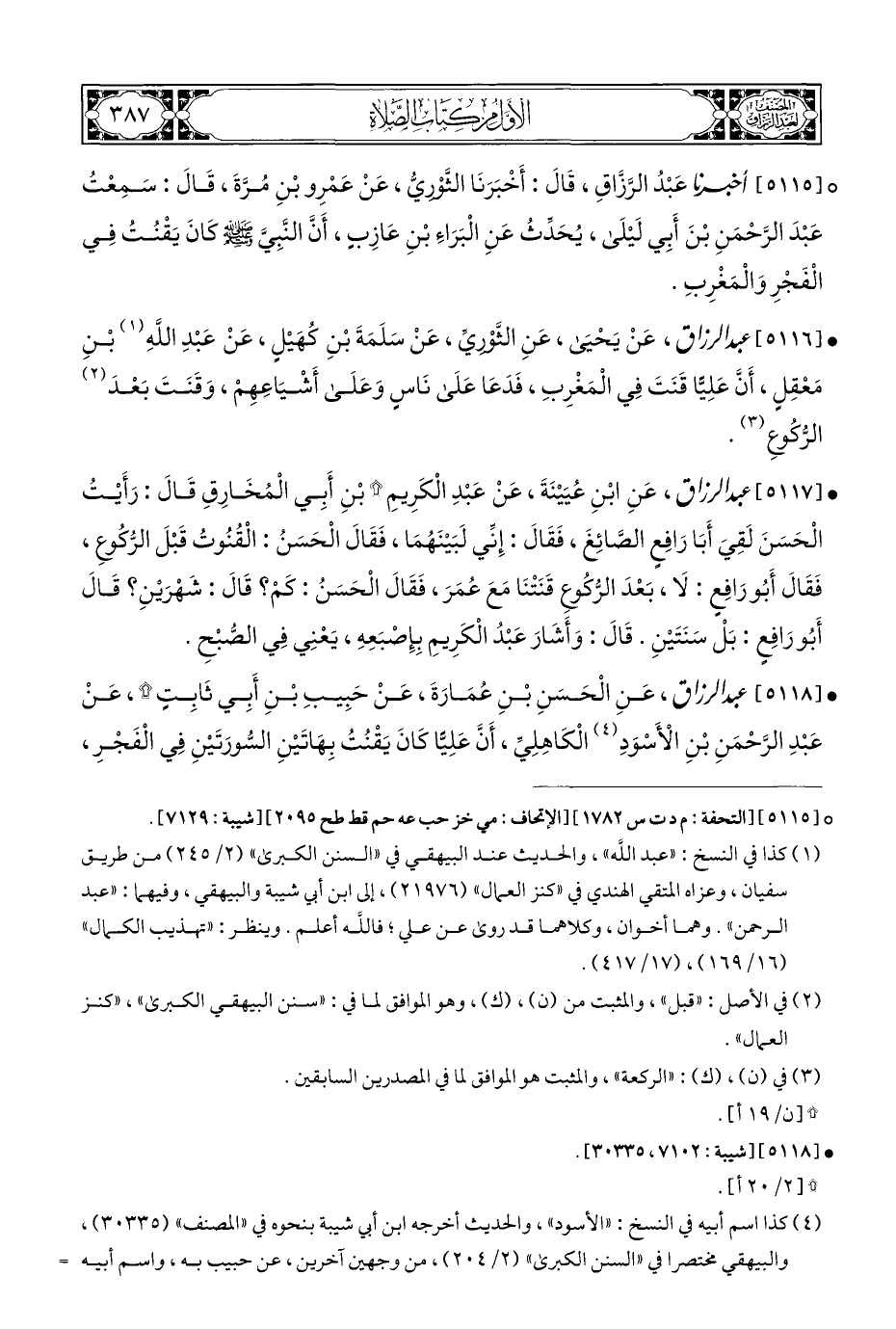 • [٥١١٦] عبد الرزاق، عَنْ يَحْيَى، عَنِ الثَّوْرِيِّ، عَنْ سَلَمَةَ بْنِ كُهَيْلٍ، عَنْ عَبْدِ اللَّهِ (¬١) بْنِ مَعْقِلٍ، أَنَّ عَلِيًّا قَنَتَ فِي الْمَغْرِبِ، فَدَعَا عَلَى نَاسٍ وَعَلَى أَشْيَاعِهِمْ، وَقَنَتَ بَعْدَ (¬٢) الرُّكُوعِ (¬٣).