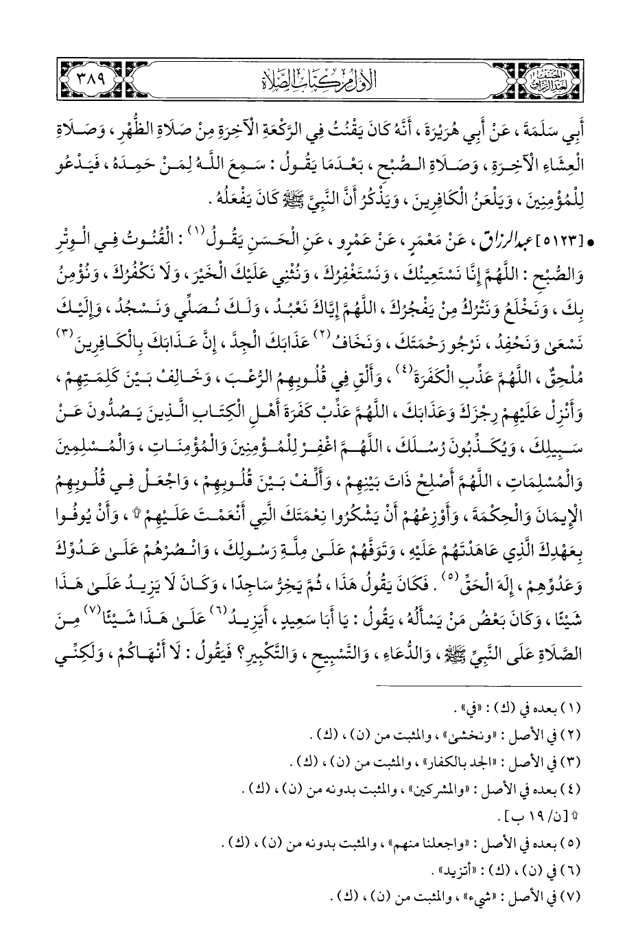 • [٥١٢٣] عبد الرزاق، عَنْ مَعْمَرٍ، عَنْ عَمْرٍو، عَنِ الْحَسَنِ يَقُولُ (¬١): الْقُنُوتُ فِي الْوِتْرِ وَالصُّبْحِ: اللَّهُمَّ إِنَّا نَسْتَعِينُكَ، وَنَسْتَغْفِرُكَ، وَنُثْنِي عَلَيْكَ الْخَيْرَ، وَلَا نَكْفُرُكَ، وَنُؤْمِنُ بِكَ، وَنَخْلَعُ وَنَتْرُكُ مِنْ يَفْجُرُكَ، اللَّهُمَّ إِياكَ نَعْبُدُ، وَلَكَ نُصَلِّي وَنَسْجُدُ، وإلَيْكَ نَسْعَى وَنَحْفِدُ، نَزجُو رَحْمَتَكَ، وَنَخَافُ (¬٢) عَذَابَكَ الْجِدَّ، إِنَّ عَذَابَكَ بِالْكَافِرِينَ (¬٣) مُلْحِقٌ، اللَّهُمَّ عَذِّبِ الْكَفَرَةَ (¬٤)، وَأَلْقِ فِي قُلُوبِهِمُ الرُّعْبَ، وَخَالِفْ بَيْنَ كَلِمَتِهِمْ، وَأَنْزِلْ عَلَيْهِمْ رِجْزَكَ وَعَذَابَكَ، اللَّهُمَّ عَذَبْ كَفَرَةَ أَهْلِ الْكِتَابِ الَّذِينَ يَصُدُّونَ عَنْ سَبِيلِكَ، وَيُكَذِّبُونَ رُسُلَكَ، اللَّهُمَّ اغْفِرْ لِلْمُؤْمِنِينَ وَالْمُؤْمِنَاتِ، وَالْمُسْلِمِينَ وَالْمُسْلِمَاتِ، اللَّهُمَّ أَصْلِحْ ذَاتَ بَيْنِهِمْ، وَأَلِّفْ بَيْنَ قُلُوبِهِمْ، وَاجْعَلْ فِي قُلُوبِهِمُ الْإِيمَانَ وَالْحِكْمَةَ، وَأَوْزِعْهُمْ أَنْ يَشْكُرُوا نِعْمَتَكَ الَّتِي أَنْعَمْتَ عَلَيْهِمْ *، وَأَنْ يُوفُوا بِعَهْدِكَ الَّذِي عَاهَدْتَهُمْ عَلَيْهِ، وَتَوَفَّهُمْ عَلَى مِلَّةِ رَسُولِكَ، وَانْصُرْهُمْ عَلَى عَدُوِّكَ وَعَدُوِّهِمْ، إِلَهَ الْحَقِّ (¬٥). فَكَانَ يَقُولُ هَذَا، ثُمَّ يَخِرُّ سَاجِدًا، وَكَانَ لَا يَزِيدُ عَلَى هَذَا شَيْئًا، وَكَانَ بَعْضُ مَنْ يَسْأَلُهُ، يَقُولُ: يَا أَبَا سَعِيدِ، أَيَزِيدُ (¬٦) عَلَى هَذَا شَيْئًا (¬٧) مِنَ الصَّلَاةِ عَلَى النَّبِيِّ - صلى الله عليه وسلم -، وَالدُّعَاءِ، وَالتَّسْبِيحِ، وَالتَّكْبِيرِ؟ فَيَقُولُ: لَا أَنْهَاكُمْ، وَلكني