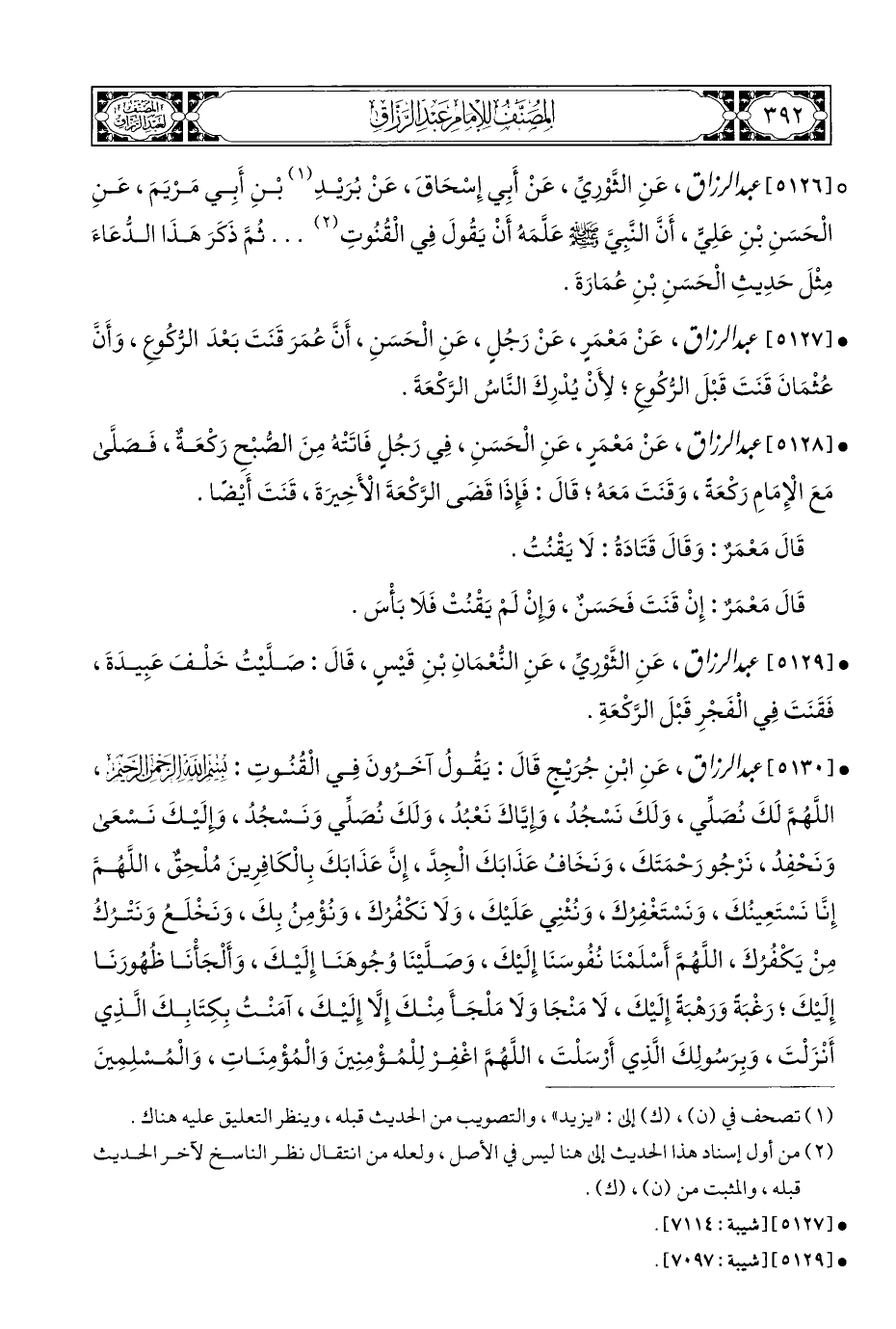 ° [٥١٢٦] عبد الرزاق، عَنِ الثَّوْرِيِّ، عَنْ أَبِي إِسْحَاقَ، عَنْ بُرَيْدِ (¬١) بْنِ أَبِي مَرْيَمَ، عَنِ الْحَسَنِ بْنِ عَلِيٍّ، أَنَّ النَّبِيَّ - صلى الله عليه وسلم - عَلَّمَهُ أَنْ يَقُولَ فِي الْقُنُوتِ (¬٢) ... ثُمَّ ذَكَرَ هَذَا الدُّعَاءَ مِثْلَ حَدِيثِ الْحَسَنِ بْنِ عُمَارَةَ.