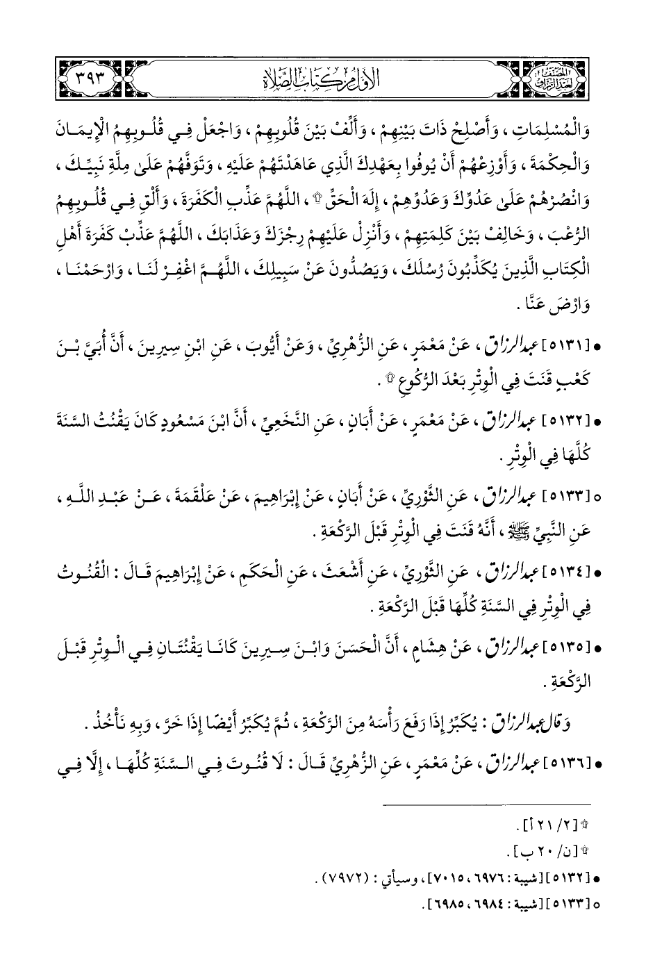 ° [٥١٣٣] عبد الرزاق، عَنِ الثَّوْرِيِّ، عَنْ أَبَانٍ، عَنْ إِبْرَاهِيمَ، عَنْ عَلْقَمَةَ، عَنْ عَبْدِ اللَّهِ، عَنِ النَّبِيِّ - صلى الله عليه وسلم -، أَنَّهُ قَنَتَ فِي الْوِتْرِ قَبْلَ الرَّكْعَةِ.