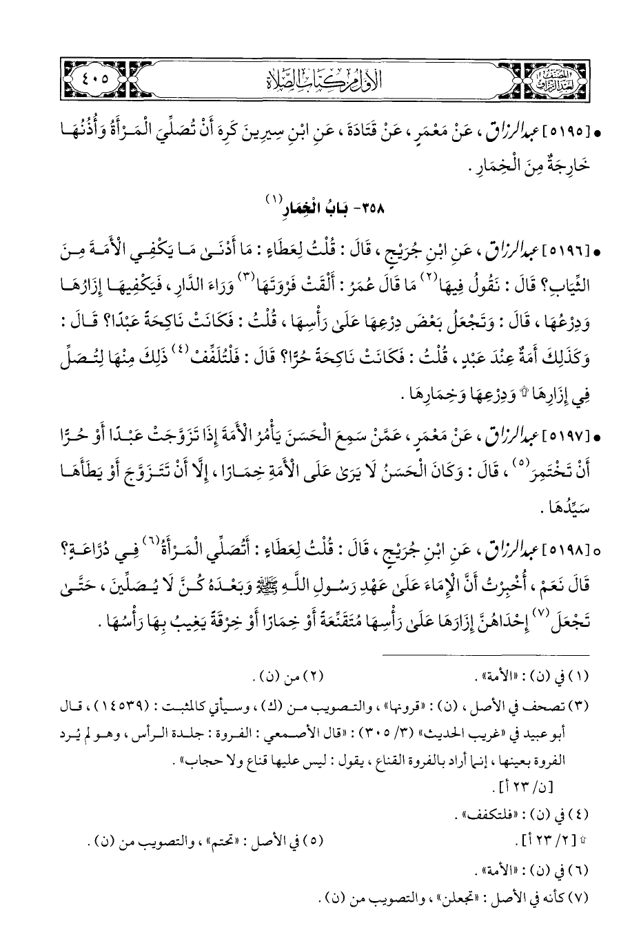 ° [٥١٩٨] عبد الرزاق، عَنِ ابْنِ جُرَيْجٍ، قَالَ: قُلْتُ لِعَطَاءٍ: أَتُصَلِّي الْمَرْأَةُ (¬٦) فِي دُرَّاعَةٍ؟ قَالَ نَعَمْ، أُخْبِرْتُ أَنَّ الْإِمَاءَ عَلَى عَهْدِ رَسُولِ اللَّهِ - صلى الله عليه وسلم - وَبَعْدَهُ كُنَّ لَا يُصلِّينَ، حَتَّى تَجْعَلَ (¬٧) إِحْدَاهُنَّ إِزَارَهَا عَلَى رَأْسِهَا مُتَقَنِّعَةً أَوْ خِمَارًا أَوْ خِرْقَةً يَغِيبُ بِهَا رَأْسُهَا.