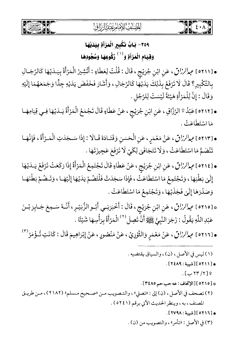 • [٥٢١١] عبد الرزاق، عَنِ ابْنِ جُرَيْجٍ، قَالَ: قُلْتُ لِعَطَاءٍ: أَتُشِيرُ الْمَرْأَةُ بِيَدَيْهَا كَالرِّجَالِ بِالتَّكْبِيرِ؟ قَالَ لَا تَرْفَعُ بِذَلِكَ يَدَيْهَا كَالرِّجَالِ، وَأَشَارَ فَخَفَضَ يَدَيْهِ جِدًّا وَجَمَعَهُمَا إِلَيْهِ وَقَالَ: إِنَّ لِلْمَرْأَةِ هَيْئَةً لَيْسَتْ لِلرَّجُلِ.