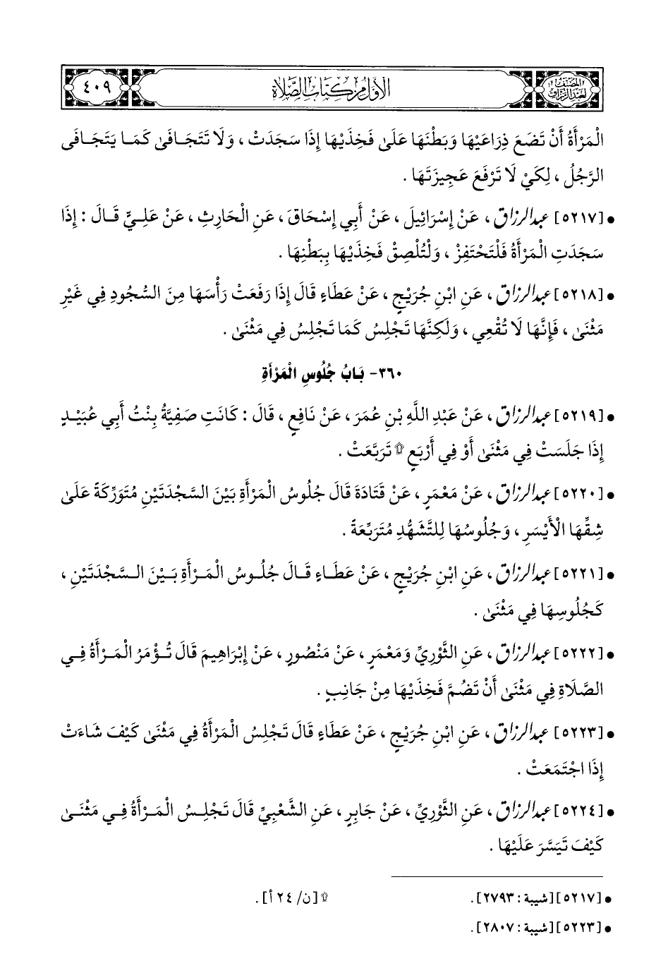 • [٥٢٢٠] عبد الرزاق، عَنْ مَعْمَرٍ، عَنْ قَتَادَةَ قَالَ جُلُوسُ الْمَرْأَةِ بَيْنَ السَّجْدَتَيْنِ مُتَوَرِّكَةً عَلَى شِقِّهَا الْأَيْسَرِ، وَجُلُوسُهَا لِلتَّشَهُّدِ مُتَرَبِّعَةً.