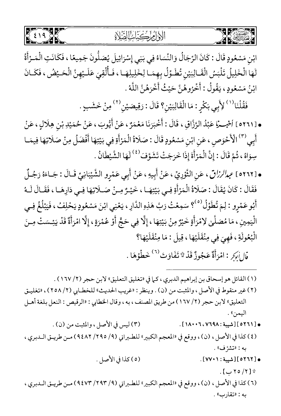 • [٥٢٦١] أخبرنا عَبْدُ الرَّزَّاقِ، قَالَ: أَخْبَرَنَا مَعْمَرٌ، عَنْ أَيوبَ، عَنْ حُمَيْدِ بْنِ هِلَالٍ، عَنْ أَبِي (¬٣) الْأَحْوَصِ، عَنِ ابْنِ مَسْعُودٍ قَالَ: صَلَاةُ الْمَرْأَةِ فِي بَيْتِهَا أَفْضلُ مِنْ صلَاتِهَا فِيمَا سِوَاهُ، ثُمَّ قَالَ: إِنَّ الْمَرْأَةَ إِذَا خَرَجَتْ تَشَوَّفَ (¬٤) لَهَا الشَّيْطَانُ.