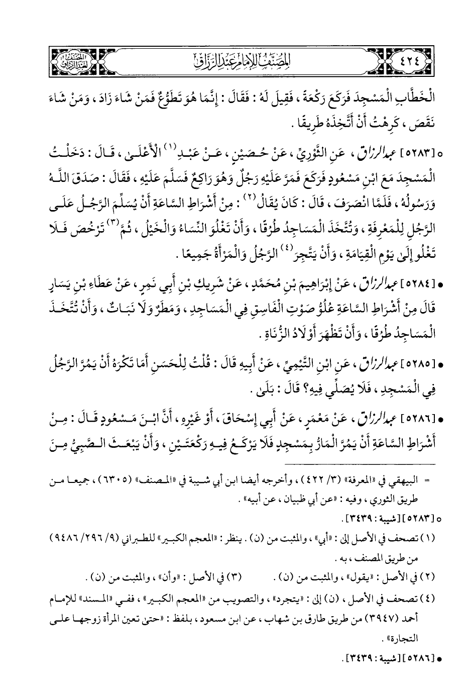 ° [٥٢٨٣] عبد الرزاق، عَنِ الثَّوْريِّ، عَنْ حُصيْنٍ، عَنْ عَبْدِ (¬١) الْأَعْلَى، قَالَ: دَخَلْتُ الْمَسْجِدَ مَعَ ابْنِ مَسْعُودٍ فَرَكَعَ فَمَرَّ عَلَيْهِ رَجُلٌ وَهُوَ رَاكِعٌ فَسَلَّمَ عَلَيْهِ، فَقَالَ: صَدَقَ اللَّهُ وَرَسُولُهُ، فَلَمَّا انْصَرَفَ، قَالَ: كَانَ يُقَالُ (¬٢): مِنْ أَشْرَاطِ السَّاعَةِ أَنْ يُسَلِّمَ الرَّجُلُ عَلَى الرَّجُلِ لِلْمَعْرِفَةِ، وَتُتَّخَذَ الْمَسَاجِدُ طُرُقًا، وَأَنْ تَغْلُوَ النِّسَاءُ وَالْخَيْلُ، ثُمَّ (¬٣) تَرْخُصَ فَلَا تَغْلُو إِلَى يَوْمِ الْقِيَامَةِ، وَأَنْ يَتَّجِرَ (¬٤) الرَّجُلُ وَالْمَرْأَةُ جَمِيعًا.