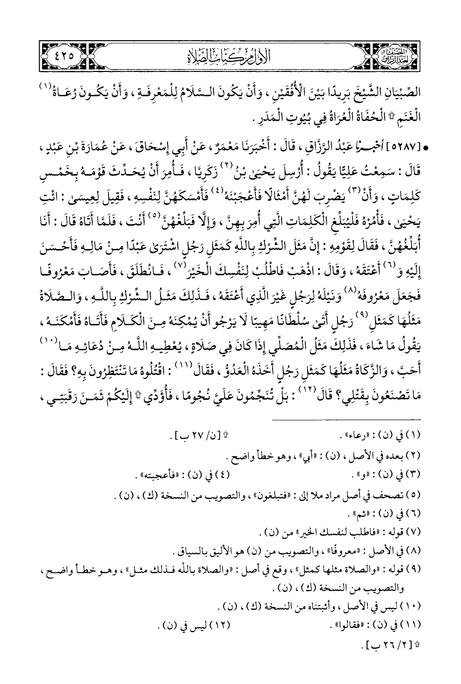 • [٥٢٨٧] أَخْبَرَنَا عَبْدُ الرَّزَّاقِ، قَالَ: أَخْبَرَنَا مَعْمَرٌ، عَنْ أَبِي إِسْحَاقَ، عَنْ عُمَارَةَ بْنِ عَبْدٍ، قَالَ: سَمِعْتُ عَلِيًّا يَقُولُ: أُرْسِلَ يَحْيَى بْنُ (¬٢) زَكَرِيَّا، فَأُمِرَ أَنْ يُحَدِّثَ قَوْمَهُ بِخَمْسِ كَلِمَاتٍ، وَأَنْ (¬٣) يَضْرِبَ لَهُنَّ أَمْثَالًا فَأَعْجَبْنَهُ (¬٤) فَأَمْسَكَهُنَّ لِنَفْسِهِ، فَقِيلَ لِعِيسَى: ائْتِ يَحْيَى، فَأْمُرْهُ فَلْيُبَلِّغِ الْكَلِمَاتِ الَّتِي أُمِرَ بِهِنَّ، وإِلَّا فَبَلّغْهُنَّ (¬٥) أَنْتَ، فَلَمَّا أَتَاهُ قَالَ: أَنَا أُبَلِّغُهُنَّ، فَقَالَ لِقَوْمِهِ: إِنَّ مَثَلَ الشِّرْكِ بِاللَّهِ كَمَثَلِ رَجُلٍ اشْتَرَى عَبْدًا مِنْ مَالِهِ فَأَحْسَنَ إِلَيْهِ وَ (¬٦) أَعْتَقَهُ، وَقَالَ: اذْهَبْ فَاطْلُبْ لِنَفْسِكَ الْخَيْرَ (¬٧)، فَانْطَلَقَ، فَأَصَابَ مَعْرُوفًا فَجَعَلَ مَعْرُوفَهُ (¬٨) وَنَيْلَهُ لِرَجُلٍ غَيْرَ الَّذِي أَعْتَقَهُ، فَذَلِكَ مَثَلُ الشِّرْكِ بِاللَّهِ، وَالصَّلَاةُ مَثَلُهَا كَمَثَلِ (¬٩) رَجُلٍ أَتَى سُلْطَانًا مَهِيبًا لَا يَرْجُو أَنْ يُمْكِنَهُ مِنَ الْكَلَامِ فَأَتَاهُ فَأَمْكَنَهُ، يَقُولُ مَا شَاءَ، فَذَلِكَ مَثَلُ الْمُصَلِّي إِذَا كَانَ فِي صَلَاةٍ، يُعْطِيهِ اللَّهُ مِنْ دُعَائِهِ مَا (¬١٠) أَحَبَّ، وَالزَّكَاةُ مَثَلُهَا كَمَثَلِ رَجُل أَخَذَهُ الْعَدُوُّ، فَقَالَ (¬١١): اقْتُلُوهُ مَا تَنْتَظِرُونَ بِهِ؟ فَقَالَ: مَا تَصْنَعُونَ بِقَتْلِي؟ قَالَ (¬١٢): بَلْ تُنَجِّمُونَ عَلَيَّ نُجُومًا، فَأُؤَدِّي * إِلَيْكُمْ ثَمَنَ رَقَبَتِي،