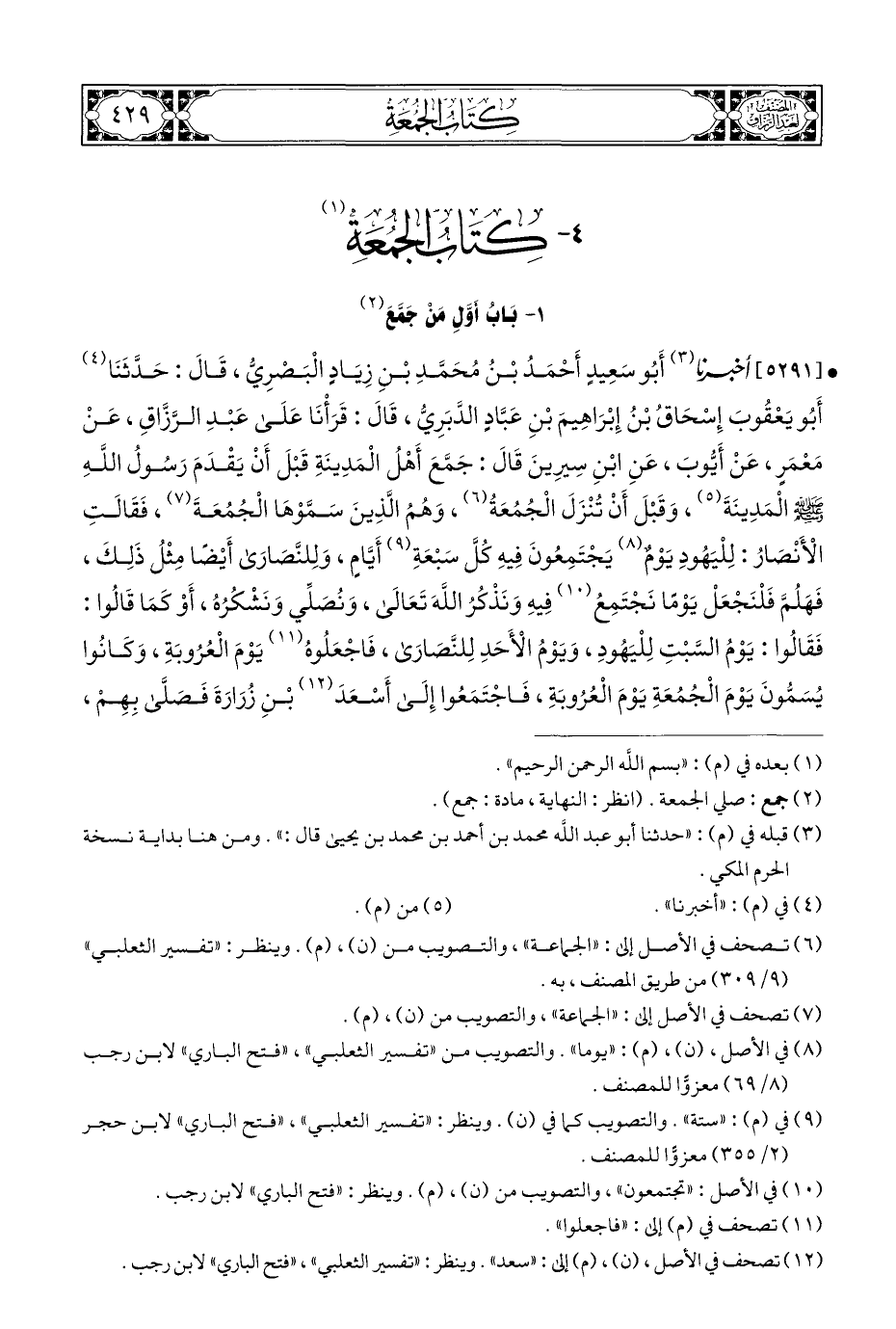 • [٥٢٩١] أخبرنا (¬٣) أَبُو سَعِيدٍ أَحْمَدُ بْنُ مُحَمَّدِ بْنِ زِيَادٍ الْبَصْرِيُّ، قَالَ: حَدَّثَنَا (¬٤) أَبُو يَعْقُوبَ إِسْحَاقُ بْنُ إِبْرَاهِيمَ بْنِ عَبَّادٍ الدَّبَرِيُّ، قَالَ: قَرَأْنَا عَلَى عَبْدِ الرَّزَّاقِ، عَنْ مَعْمَرٍ، عَنْ أَيُّوبَ، عَنِ ابْنِ سِيرِينَ قَالَ: جَمَّعَ أَهْلُ الْمَدِينَةِ قَبْلَ أَنْ يَقْدَمَ رَسُولُ اللَّهِ - صلى الله عليه وسلم - الْمَدِينَةَ (¬٥)، وَقَبْلَ أَنْ تُنْزَلَ الْجُمُعَةُ (¬٦)، وَهُمُ الَّذِينَ سَمَّوْهَا الْجُمُعَةَ (¬٧)، فَقَالَتِ الْأَنْصَارُ: لِلْيَهُودِ يَوْمٌ (¬٨) يَجْتَمِعُونَ فِيهِ كُلَّ سَبْعَةِ (¬٩) أَيَّامٍ، وَلِلنَّصَارَى أَيْضا مِثْلُ ذَلِكَ، فَهَلُمَّ فَلْنَجْعَلْ يَوْمًا نَجْتَمِعُ (¬١٠) فِيهِ وَنَذْكُرُ اللهَ تَعَالَى، وَنُصَلِّي وَنَشْكُرُهُ، أَوْ كَمَا قالُوا: فَقَالُوا: يَوْمُ السَّبْتِ لِلْيَهُودِ، وَيَوْمُ الْأَحَدِ لِلنَّصارَى، فَاجْعَلُوهُ (¬١١) يَوْمَ الْعُرُوبَةِ، وَكانُوا يُسَمُّونَ يَوْمَ الْجُمُعَةِ يَوْمَ الْعُرُوبَةِ، فَاجْتَمَعُوا إِلَى أَسْعَدَ (¬١٢) بْنِ زُرَارَةَ فَصَلَّى بِهِمْ،
