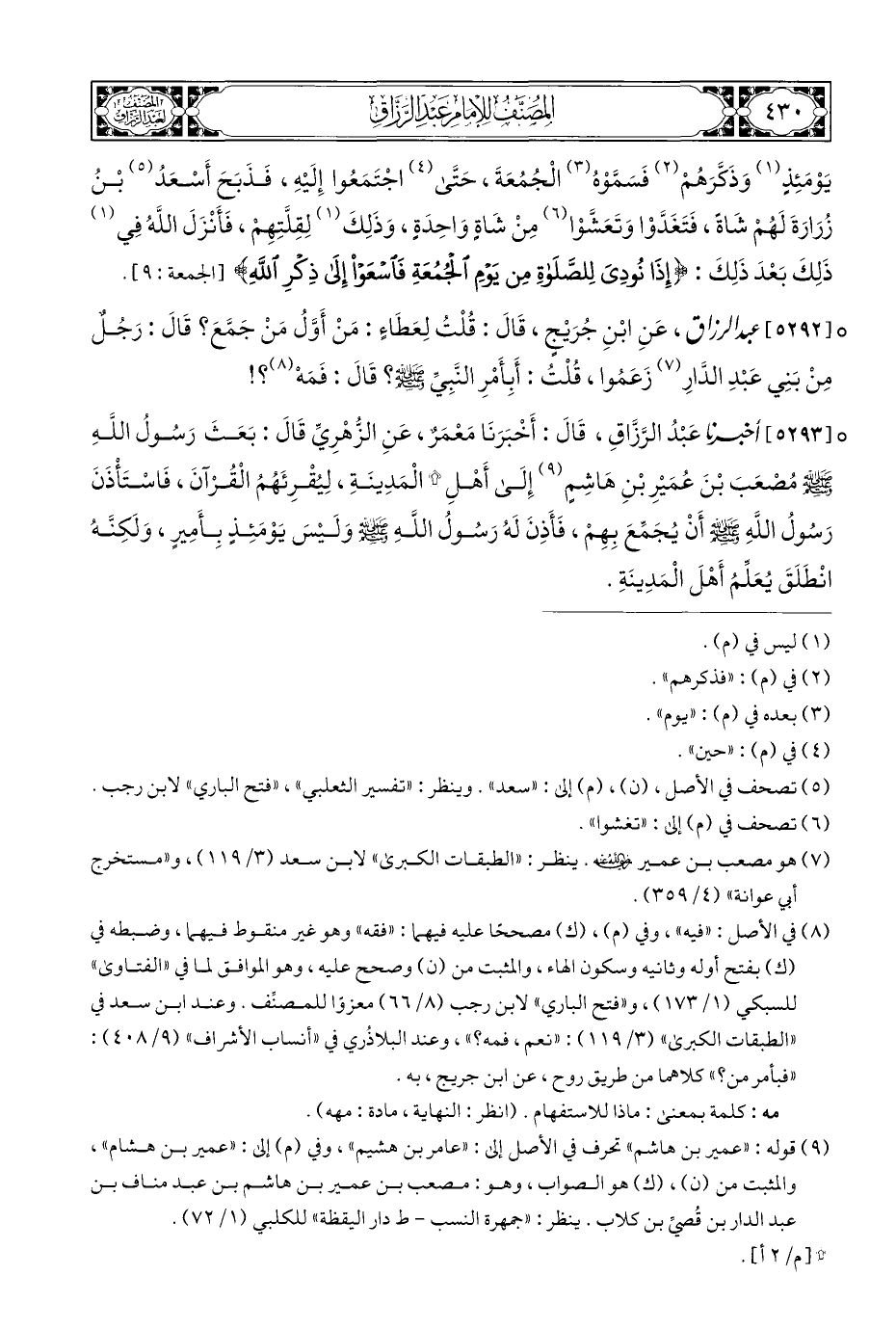 ° [٥٢٩٣] عَبْدُ الرَّزَّاقِ، قَالَ: أَخْبَرَنَا مَعْمَرٌ، عَنِ الزُّهْرِيِّ قَالَ: بَعَثَ رَسُولُ اللَّهِ - صلى الله عليه وسلم - مُصْعَبَ بْنَ عُمَيْرِ بْنِ هَاشِمٍ (¬٩) إِلَى أَهْلِ * الْمَدِينَةِ، لِيُقْرِئَهُمُ الْقُرْآنَ، فَاسْتَأْذَنَ رَسُولُ اللَّهِ - صلى الله عليه وسلم - أَنْ يُجَمِّعَ بِهِمْ، فَأَذِنَ لَهُ رَسُولُ اللَّهِ - صلى الله عليه وسلم - وَلَيْسَ يَوْمَئِذٍ بِأَمِيرٍ، وَلَكِنَّهُ انْطَلَقَ يُعَلِّمُ أَهْلَ الْمَدِينَةِ.