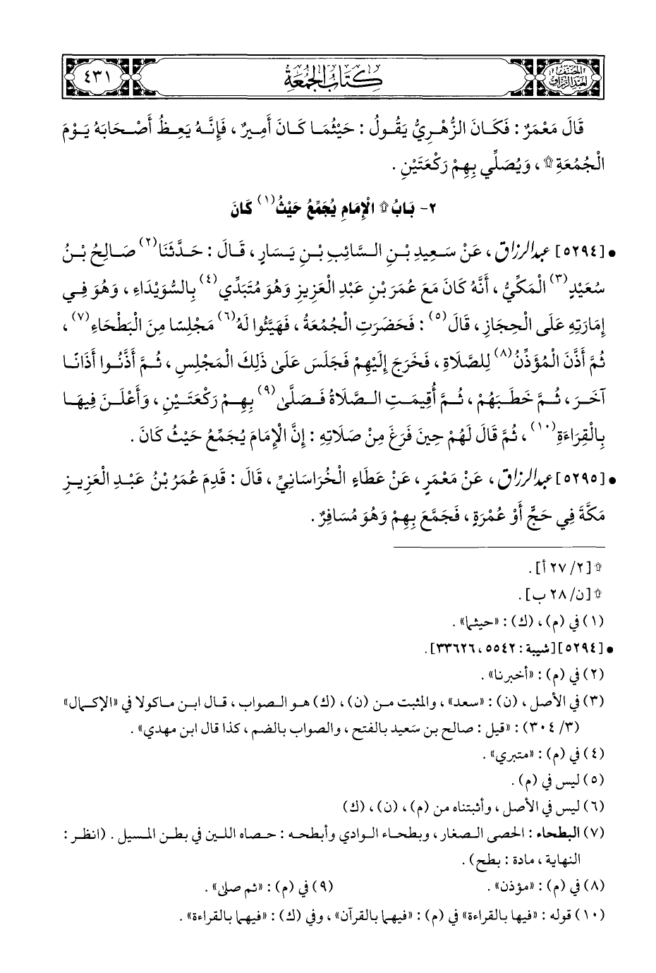 • [٥٢٩٤] عبد الرزاق، عَنْ سَعِيدِ بْنِ السَّائِبِ بْنِ يَسَارٍ، قَالَ: حَدَّثَنَا (¬٢) صالِحُ بْنُ سُعَيْدٍ (¬٣) الْمَكِّيُّ، أَنَّهُ كَانَ مَع عُمَرَ بْنِ عَبْدِ الْعَزِيزِ وَهُوَ مُتَبَدِّي (¬٤) بِالسُّوَيْدَاءِ، وَهُوَ فِي إِمَارَتِهِ عَلَى الْحِجَازِ، قَالَ (¬٥): فَحَضَرَتِ الْجُمُعَةُ، فَهَيَّئُوا لَهُ (¬٦) مَجْلِسًا مِنَ الْبَطْحَاءِ (¬٧)، ثُمَّ أَذَّنَ الْمُؤَذِّنُ (¬٨) لِلصَّلَاةِ، فَخَرَجَ إِلَيْهِمْ فَجَلَسَ عَلَى ذَلِكَ الْمَجْلِسِ، لُمَّ أَذَّنُوا أَذَانَا آخَرَ، ثُمَّ خَطَبَهُمْ، ثُمَّ أُقِيمَتِ الصَّلَاةُ فَصَلَّى (¬٩) بِهِمْ رَكْعَتَيْنِ، وَأَعْلَنَ فِيهَا بِالْقِرَاءَةِ (¬١٠)، ثُمَّ قَالَ لَهُمْ حِينَ فَرَغَ مِنْ صَلَاتِهِ: إِنَّ الْإِمَامَ يُجَمِّعُ حَيْثُ كَانَ.