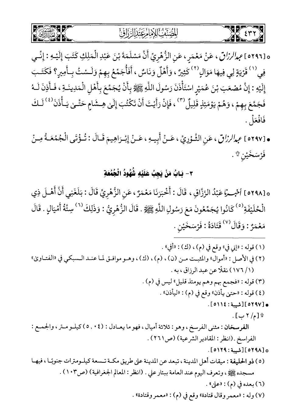 ° [٥٢٩٨] أَخْبَرَنَا عَبْدُ الرَّزَّاقِ، قَالَ: أَخْبَرَنَا مَعْمَرٌ، عَنِ الزُّهْرِيِّ قَالَ: بَلَغَنِي أَنَّ أَهْلَ ذِي الْحُلَيْفَةِ (¬٥) كَانُوا يُجَمِّعُونَ مَعَ رَسُولِ اللَّهِ - صلى الله عليه وسلم -. قَالَ الزُّهْرِيُّ: وَذَلِكَ (¬٦) سِتَّةُ أَمْيَالٍ. قَالَ مَعْمَرٌ: وَقَالَ (¬٧) قَتَادَةُ: فَرْسَخَيْنِ.