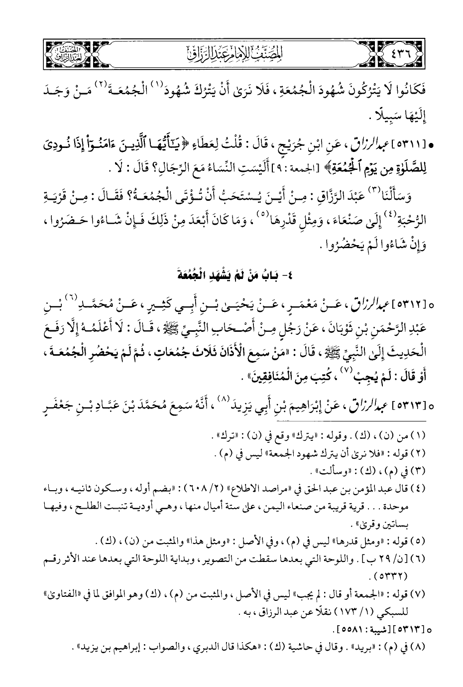 (¬٧) قوله: "الجمعة أو قال: لم يجب" ليس في الأصل، والمثبت من (م)، (ك) وهو الموافق لما في "الفتاوى" للسبكي (١/ ١٧٣) نقلًا عن عبد الرزاق، به.