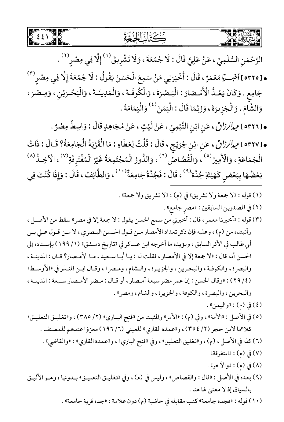 (¬٣) قوله: "أخبرنا معمر، قال: أخبرني من سمع الحسن يقول: لا جمعة إِلَّا في مصر" سقط من الأصل، وأثبتناه من (م)، وعليه فإن ذكر تعداد الأمصار من قول الحسن البصري، لا من قول علي بن أبي طالب في الأثر السابق، ويؤيده ما أخرجه ابن عساكر في "تاريخ دمشق" (١/ ١٩٩) بإسناده إلى الحسن أنه قال: "لا جمعة إِلَّا في الأمصار، فقلت له: يا أبا سعيد، ما الأمصار؟ قال: المدينة، والبصرة، والكوفة، والبحرين، والجزيرة، والشام، ومصر"، وقال ابن المنذر في "الأوسط" (٤/ ٢٩): "وقال الحسن: إن عمر مصّر سبعة أمصار، أو قال: مصّر الأمصار سبعة: المدينة، والبحرين، والبصرة، والكوفة، والجزيرة، والشام، ومصر".