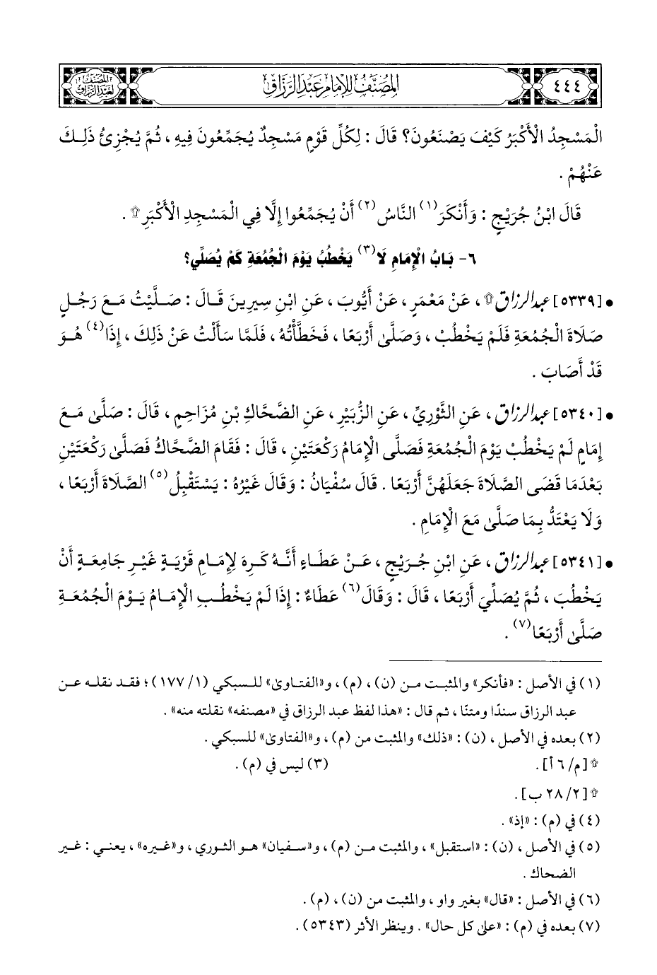 (¬١) في الأصل: "فأنكر" والمثبت من (ن)، (م)، و"الفتاوى" للسبكي (١/ ١٧٧)؛ فقد نقله عن عبد الرزاق سندًا ومتنًا، ثم قال: "هذا لفظ عبد الرزاق في "مصنفه" نقلته منه".