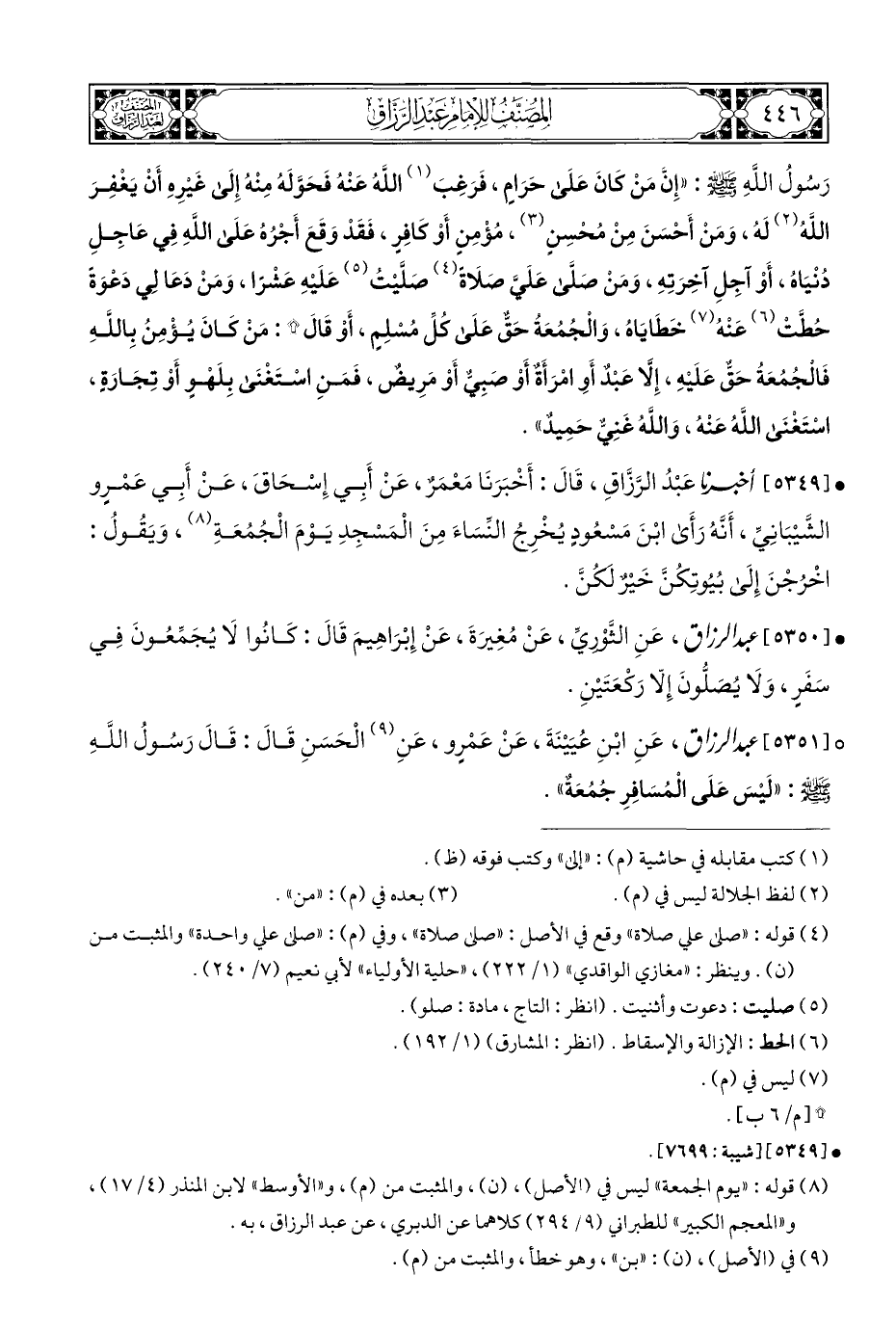 ° [٥٣٥١] عبد الرزاق، عَنِ ابْنِ عُيَيْنَةَ، عَنْ عَمْرٍو، عَنِ (¬٩) الْحَسَنِ قَالَ: قَالَ رَسُولُ اللَّهِ - صلى الله عليه وسلم -: "لَيْسَ عَلَى الْمُسَافِرِ جُمُعَةٌ".