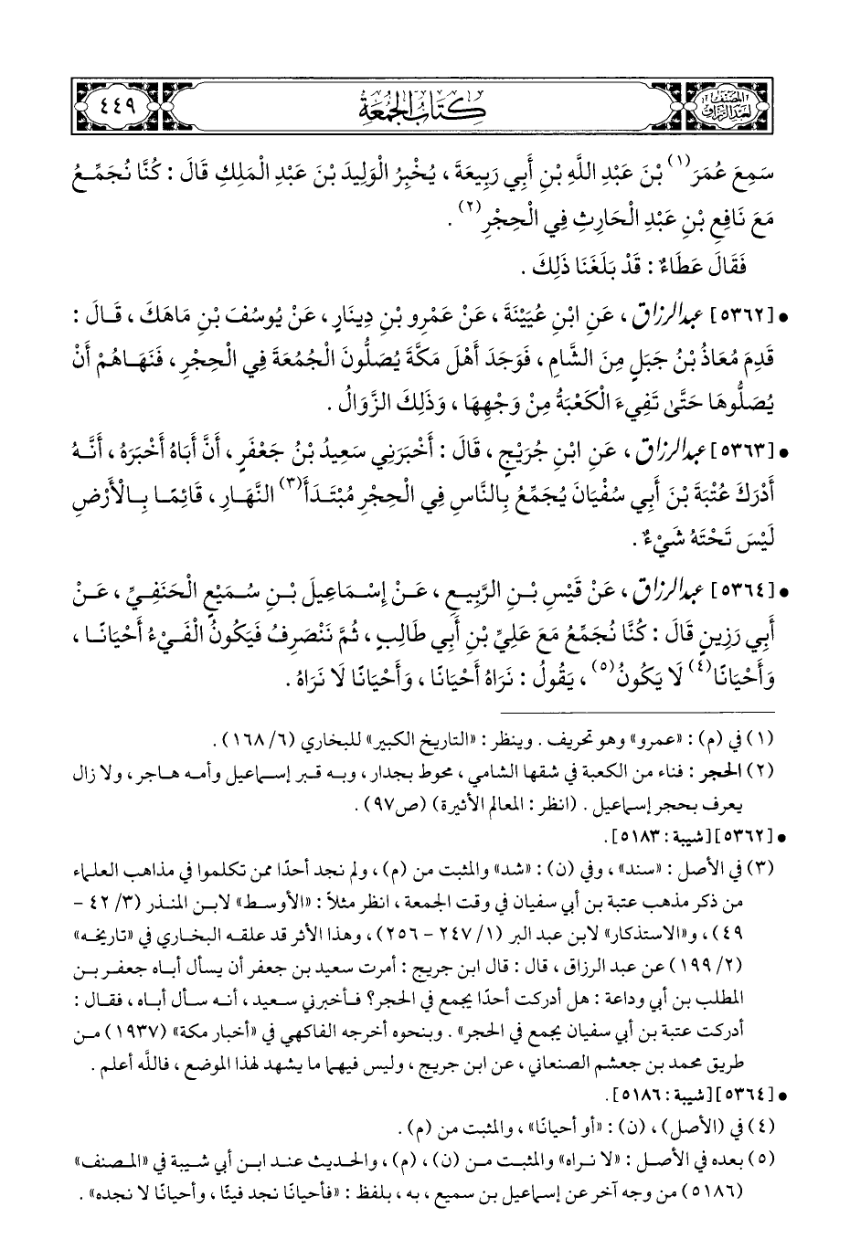 (¬٣) في الأصل: "سند"، وفي (ن): "شد" والمثبت من (م)، ولم نجد أحدًا ممن تكلموا في مذاهب العلماء من ذكر مذهب عتبة بن أبي سفيان في وقت الجمعة، انظر مثلًا: "الأوسط" لابن المنذر (٣/ ٤٢ - ٤٩)، و"الاستذكار" لابن عبد البر (١/ ٢٤٧ - ٢٥٦)، وهذا الأثر قد علقه البخاري في "تاريخه" (٢/ ١٩٩) عن عبد الرزاق، قال: قال ابن جريج: أمرت سعيد بن جعفر أن يسأل أباه جعفر بن المطلب بن أبي وداعة: هل أدركت أحذا يجمع في الحجر؟ فأخبرني سعيد، أنه سأل أباه، فقال: أدركت عتبة بن أبي سفيان يجمع في الحجر". وبنحوه أخرجه الفاكهي في "أخبار مكة" (١٩٣٧) من طريق محمد بن جعشم الصنعاني، عن ابن جريج، وليس فيهما ما يشهد لهذا الموضع، فالله أعلم.