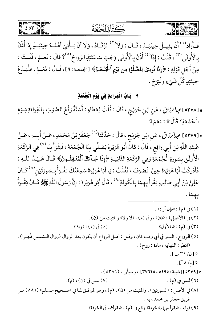 ° [٥٣٧٩] عبد الرزاق، عَنِ ابْنِ جُرَيْجٍ، قَالَ: حَدَّثَنَا (¬٦) جَعْفَرُ بْنُ مُحَمَّدٍ، عَنْ أَبِيهِ، عَنْ عُبَيْدِ اللهِ بْنِ أَبِي رَافِعٍ، قَالَ: كَانَ أَبُو هُرَيْرة يُصَلِّي بِنَا الْجُمُعَةَ، فَيقْرَأُ بِنَا (¬٧) فِي الرَّكْعَةِ الْأُولَى بِسُورَةِ الْجُمُعَةِ وَفِي الرَّكْعَةِ الثَّانِيَةِ {إِذَا جَاءَكَ الْمُنَافِقُونَ} قَالَ عُبَيْدُ اللهِ: فَأَدْرَكْتُ أَبَا هُرَيْرَةَ حِينَ انْصَرَفَ، فَقُلْتُ: يَا أَبَا هُرَيْرة سَمِعْتُكَ تَقْرَأُ بِسُورَتَيْنِ (¬٨) كَانَ عَلِيُّ بْنُ أَبِي طَالِبٍ يَقْرَأُ بِهِمَا بِالْكُوفَةِ (¬٩)، قَالَ أَبُو هُرَيْرَةَ: إِنَّ رَسُولَ اللهِ - صلى الله عليه وسلم - كَانَ يَقْرَأُ بِهِمَا.