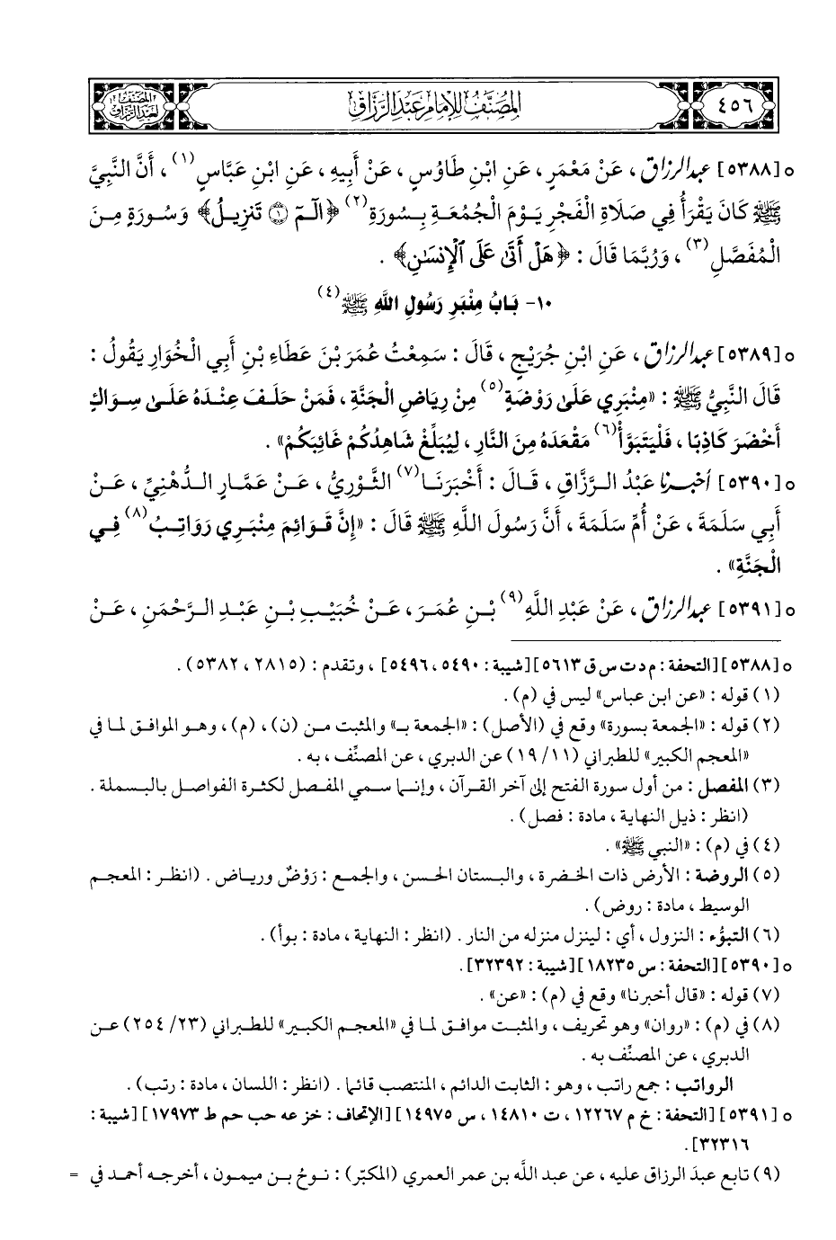 ° [٥٣٨٨] عبد الرزاق، عَنْ مَعْمَرٍ، عَنِ ابْنِ طَاوُسٍ، عَنْ أَبيهِ، عَنِ ابْنِ عَبَّاسٍ (¬١)، أَنَّ النَّبِيَّ - صلى الله عليه وسلم - كَانَ يَقْرَأُ فِي صَلَاةِ الْفَجْرِ يَوْمَ الْجُمُعَةِ بِسُورَةِ (¬٢) {الم (١) تَنرِيلُ} وَسُورَةٍ مِنَ الْمُفَصَّلِ (¬٣)، وَرُبَّمَا قَالَ: {هَلْ أَتَى عَلَى الْإِنْسَانِ}.