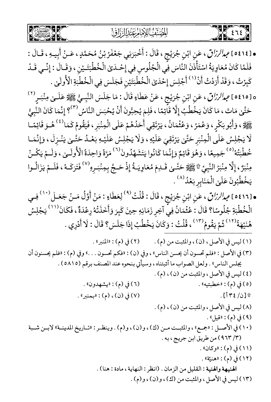 • [٥٤١٦] عبد الرزاق، عَنِ ابْنِ جُرَيْجٍ، قَالَ: قُلْتُ (¬٩) لِعَطَاءٍ: مَنْ أَوَّلُ مَنْ جَعَلَ (¬١٠) فِي الْخُطْبَةِ جُلُوسًا؟ قَالَ: عُثْمَانُ فِي آخِرِ زَمَانِهِ حِينَ كَبِرَ وَأَخَذَتْهُ رِعْدَةٌ، فَكَانَ (¬١١) يَجْلِسُ هُنَيْهَةً (¬١٢) ثُمَّ يَقُومُ (¬١٣)، قُلتُ: وَكَانَ يَخْطُبُ إِذَا جَلسَ؟ قَال: لا أدْرِي.