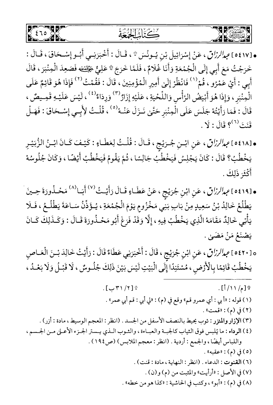 • [٥٤١٧] عبد الرزاق، عَنْ إِسْرَائِيلَ بْنِ يُونُسَ *، قَالَ: أَخْبَرَنِي أَبُو إِسْحَاقَ، قَالَ: خَرَجْتُ مَعَ أَبِي إِلَى الْجُمُعَةِ وَأَنَا غُلَامٌ، فَلَمَّا خَرَجَ * عَلِيٌّ - رضي الله عنه - فَصعِدَ الْمِنْبَرَ، قَالَ أَبِي: أَيْ عَمْرُو، قُمْ (¬١) فَانْظُرْ إِلَى أَمِيرِ الْمُؤْمِنِينَ، قَالَ: فَقُمْتُ (¬٢) فَإِذَا هُوَ قَائِمٌ عَلَى الْمِنْبَرِ، وَإِذَا هُوَ أَبْيَضُ الرَّأْسِ وَاللِّحْيَةِ، عَلَيْهِ إِزَارٌ (¬٣) وَرِدَاءٌ (¬٤)، لَيْسَ عَلَيْهِ قَمِيصٌ، قَالَ: فَمَا رَأَيْتُهُ جَلَسَ عَلَى الْمِنْبَرِ حَتَّى نَزَلَ عَنْهُ (¬٥)، قُلْتُ لِأَبِي إِسْحَاقَ: فَهَلْ قَنَت؟ (¬٦) قال: لَا.