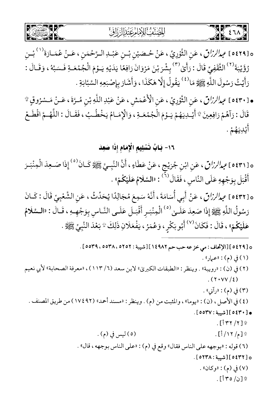 ° [٥٤٣٢] عبد الرزاق، عَنْ أَبِي أُسَامَةَ، أَنَّهُ سَمِعَ مُجَالِدًا يُحَدِّثُ، عَنِ الشَّعْبِيِّ قَالَ: كَانَ رَسُولُ اللهِ - صلى الله عليه وسلم - إِذَا صَعِدَ عَلَي (٥) الْمِنْبَرِ أَقْبَلَ عَلَى النَّاسِ بِوَجْهِهِ، قَالَ: "السَّلَامُ عَلَيكُمْ"، قَالَ: فَكَانَ (¬٧) أَبُو بَكْرٍ، وَعُمَرُ، يَفْعَلَانِ ذَلِكَ * بَعْدَ النَّبِيِّ - صلى الله عليه وسلم -.