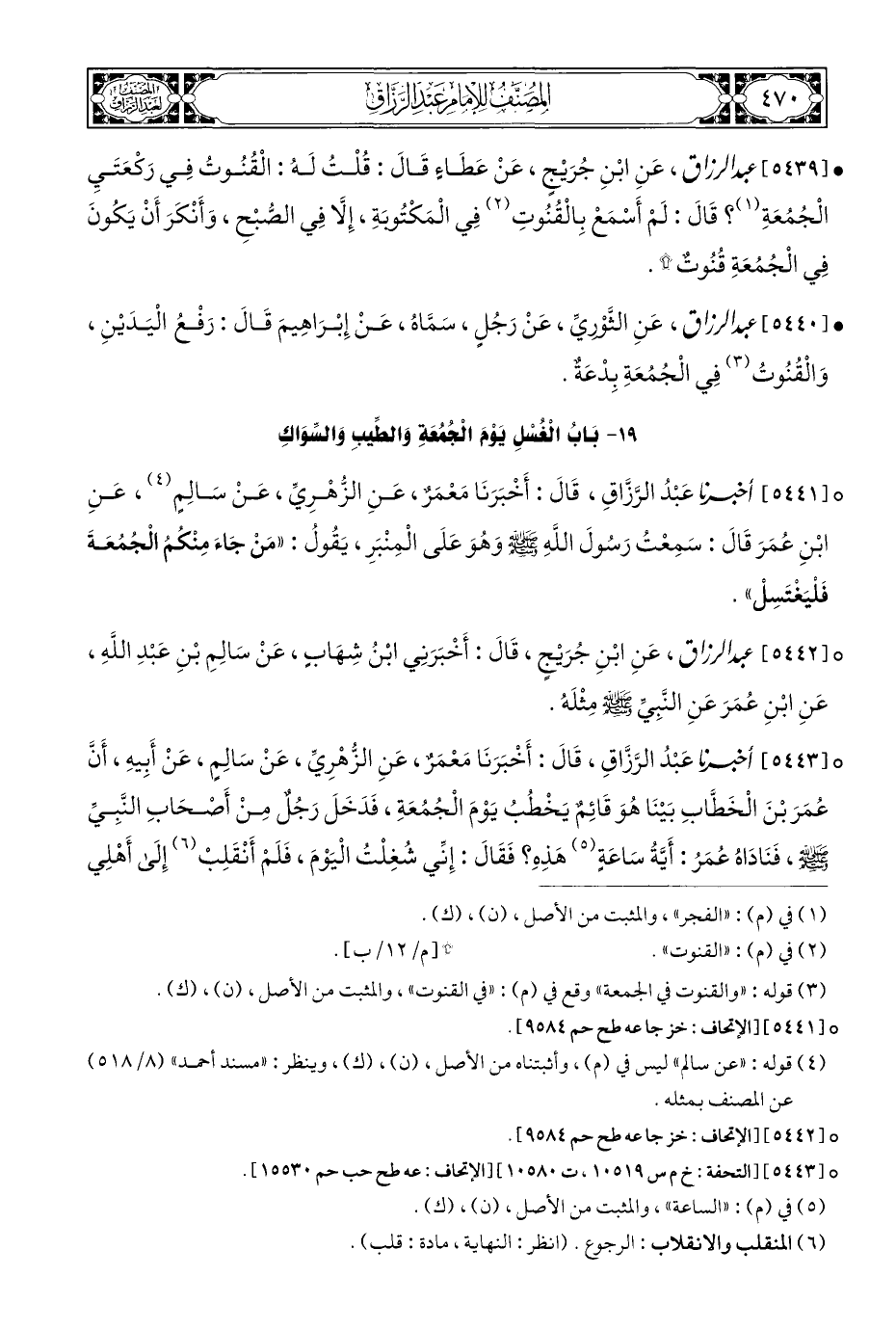 ° [٥٤٤٣] أخبرنا عَبْدُ الرَّزَّاقِ، قَالَ: أَخْبَرَنَا مَعْمَرٌ، عَنِ الزُّهْرِيِّ، عَنْ سَالِمٍ، عَنْ أَبِيهِ، أَنَّ عُمَرَ بْنَ الْخَطَّابِ بَيْنَا هُوَ قَائِمٌ يَخْطُبُ يَوْمَ الْجُمُعَةِ، فَدَخَلَ رَجُلٌ مِنْ أَصْحَابِ النَّبِيِّ - صلى الله عليه وسلم -، فَنَادَاهُ عُمَرُ: أَيَّةُ سَاعَةٍ (¬٥) هَذِهِ؟ فَقَالَ: إِنِّي شُغِلْتُ الْيَوْمَ، فَلَمْ أَنْقَلِبْ (¬٦) إِلَى أَهْلِي