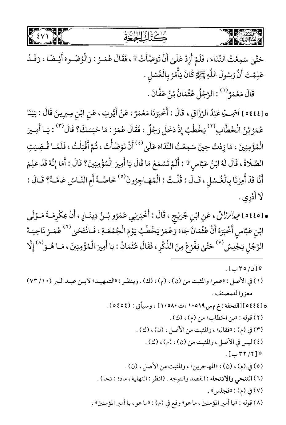 ° [٥٤٤٤]، أخبرنا عَبْدُ الرَّزَّاقِ، قَالَ: أَخْبَرَنَا مَعْمَرٌ، عَنْ أَيُّوبَ، عَنِ ابْنِ سِيرِينَ قَالَ: بَيْنَا عُمَرُ بْنُ الْخَطَّابِ (¬٢) يَخْطُبُ إِذْ دَخَلَ رَجُلٌ، فَقَالَ عُمَرُ: مَا حَبَسَكَ؟ قَالَ (¬٣): يَا أَمِيرَ الْمُؤْمِنِينَ، مَا زِدْتُ حِينَ سَمِعْتُ النِّدَاءَ عَلَى (¬٤) أَنْ تَوَضَّأْتُ، ثُمَّ أَقْبَلْتُ، فَلَمَّا قُضِيَتِ الصَّلَاةُ، قَالَ لَهُ ابْنُ عَبَّاسٍ *: أَلَمْ تَسْمَعْ مَا قَالَ يَا أَمِيرَ الْمُؤْمِنِينَ؟ قَالَ: أَمَا إِنَّهُ قَدْ عَلِمَ أَنَّا قَدْ أُمِرْنَا بِالْغُسْلِ، قَالَ: قُلْتُ: الْمُهَاجِرُونَ (¬٥) خَاصَّةً أَمِ النَّاسُ عَامَّةً؟ قَالَ: لَا أَدْرِي.