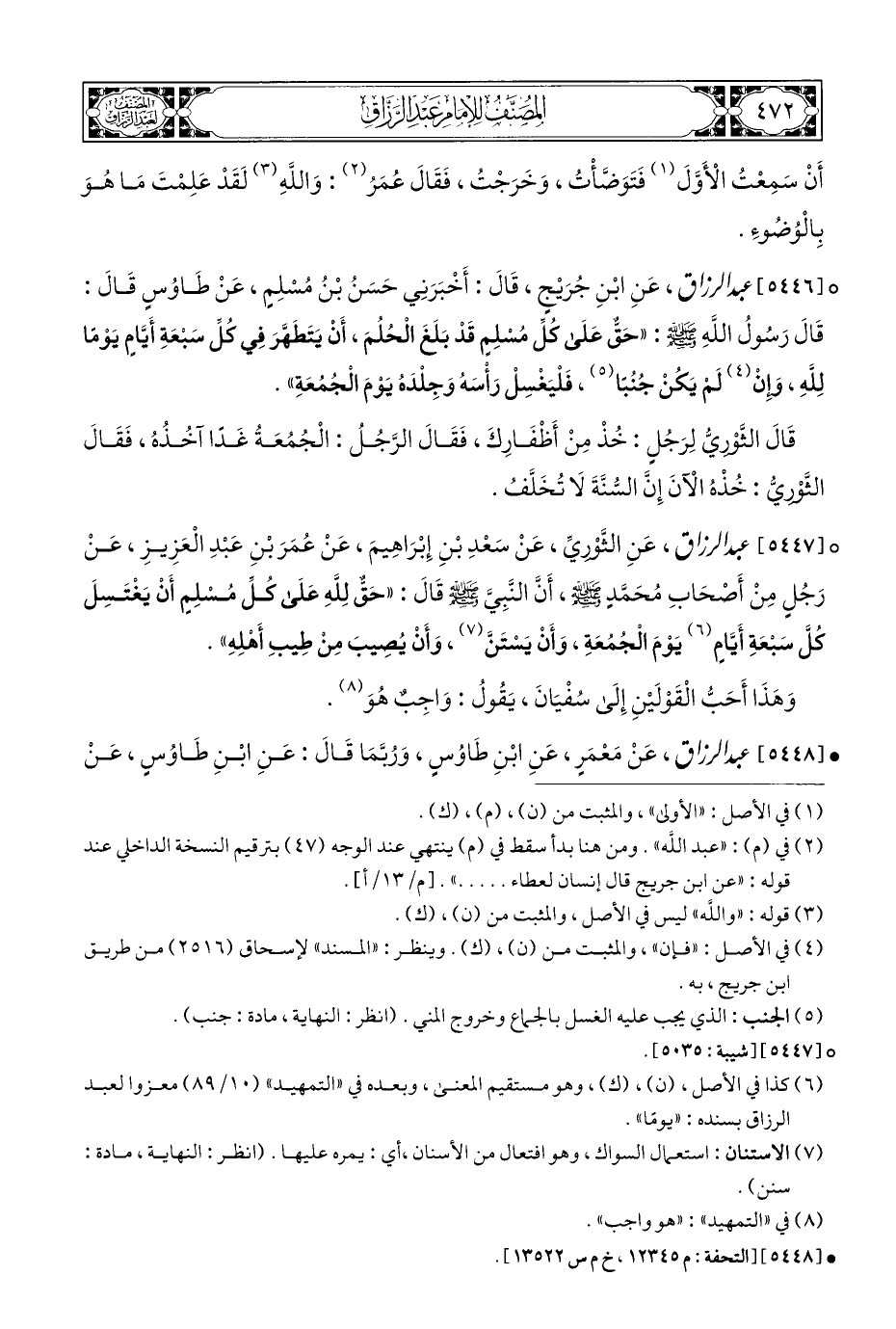 ° [٥٤٤٧] عبد الرزاق، عَنِ الثَّوْرِيِّ، عَنْ سَعْدِ بْنِ إِبْرَاهِيمَ، عَنْ عُمَرَ بْنِ عَبْدِ الْعَزِيزِ، عَنْ رَجُلٍ مِنْ أَصْحَابِ مُحَمَّدٍ - صلى الله عليه وسلم -، أَنَّ النَّبِيَّ - صلى الله عليه وسلم - قَالَ: "حَقٌّ للهِ عَلَى كُلِّ مُسْلِمٍ أَنْ يَغْتَسِلَ كُلَّ سَبعَةِ أَيَّامٍ (¬٦) يَوْمَ الْجُمُعَةِ، وَأَنْ يَسْتَنَّ (¬٧)، وَأَنْ يُصِيبَ مِن طِيبِ أَهْلِهِ".