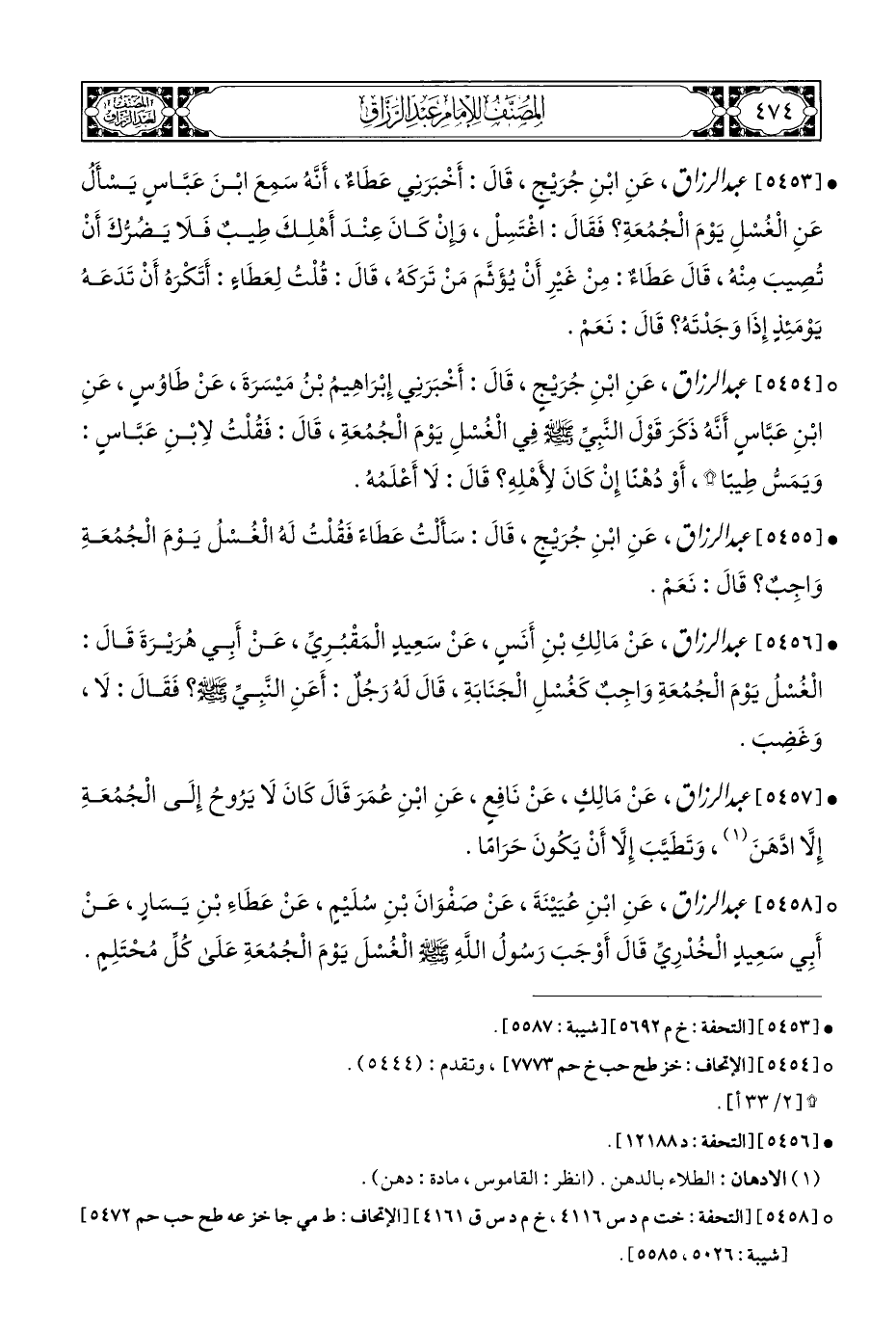 • [٥٤٥٧] عبد الرزاق، عَنْ مَالِكٍ، عَنْ نَافِعٍ، عَنِ ابْنِ عُمَرَ قَالَ كَانَ لَا يَرُوحُ إِلَى الْجُمُعَةِ إِلَّا ادَّهَنَ (¬١)، وَتَطَيَّبَ إِلَّا أَنْ يَكُونَ حَرَامًا.