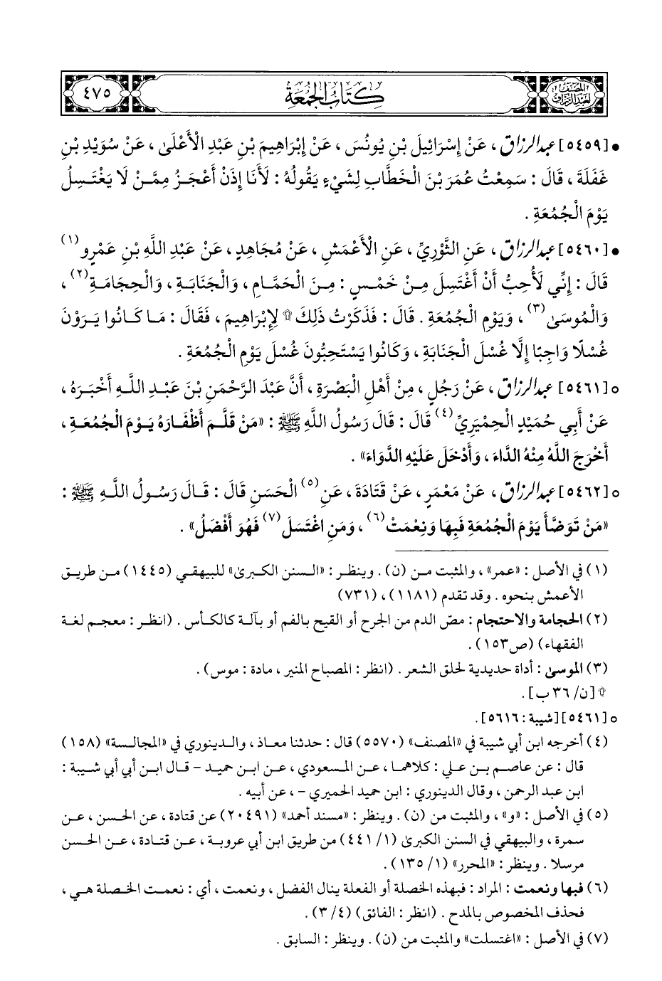 • [٥٤٦٠] عبد الرزاق، عَنِ الثَّوْرِيِّ، عَنِ الْأَعْمَشِ، عَنْ مُجَاهِدٍ، عَنْ عَبْدِ اللهِ بْنِ عَمْرٍو (¬١) قَالَ: إِنِّي لأُحِبُّ أَنْ أَغْتَسِلَ مِنْ خَمْسٍ: مِنَ الْحَمَّامِ، وَالْجَنَابَةِ، وَالْحِجَامَةِ (¬٢)، وَالْمُوسَى (¬٣)، وَيَوْمِ الْجُمُعَةِ. قَالَ: فَذَكَرْتُ ذَلِكَ * لإِبْرَاهِيمَ، فَقَالَ: مَا كَانُوا يَرَوْنَ غُسْلًا وَاجِبًا إِلَّا غُسْلَ الْجَنَابَةِ، وَكَانُوا يَسْتَحِبُّونَ غُسْلَ يَوْمِ الْجُمُعَةِ.