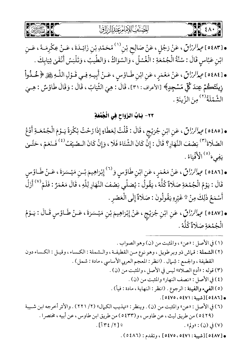 • [٥٤٨٣] عبد الرزاق، عَنْ رَجُلٍ، عَنْ صالِحِ بْنِ (¬١) مُحَمَّدِ بْنِ زَائِدَةَ، عَنْ عِكْرِمَةَ، عَنِ ابْنِ عَبَّاسٍ قَالَ: سُنَّةُ الْجُمُعَةِ: الْغُسْلُ، وَالسِّوَاكُ، وَالطِّيبُ، وَتَلْبَسُ أَنْقَى ثِيَابِكَ.