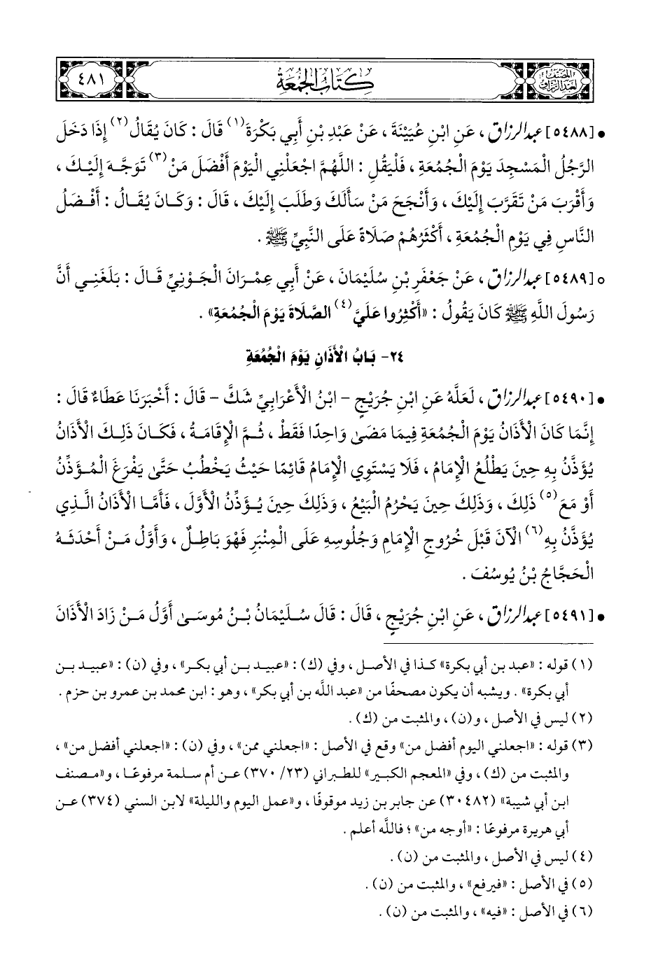 • [٥٤٨٨] عبد الرزاق، عَنِ ابْنِ عُيَيْنَةَ، عَنْ عَبْدِ بْنِ أَبِي بَكْرَةَ (¬١) قَالَ: كَانَ يُقَالُ (¬٢) إِذَا دَخَلَ الرَّجُلُ الْمَسْجِدَ يَوْمَ الْجُمُعَةِ، فَلْيقُلِ: اللَّهُمَّ اجْعَلْنِي الْيَوْمَ أَفْضَلَ مَنْ (¬٣) تَوَجَّهَ إِلَيْكَ، وَأَقْرَبَ مَنْ تَقَرَّبَ إِلَيْكَ، وَأَنْجَحَ مَنْ سَأَلَكَ وَطَلَبَ إِلَيْكَ، قَالَ: وَكَانَ يُقَالُ: أَفْضَلُ النَّاسِ فِي يَوْمِ الْجُمُعَةِ، أَكْثَرُهُمْ صَلَاةً عَلَى النَّبِيِّ - صلى الله عليه وسلم -.