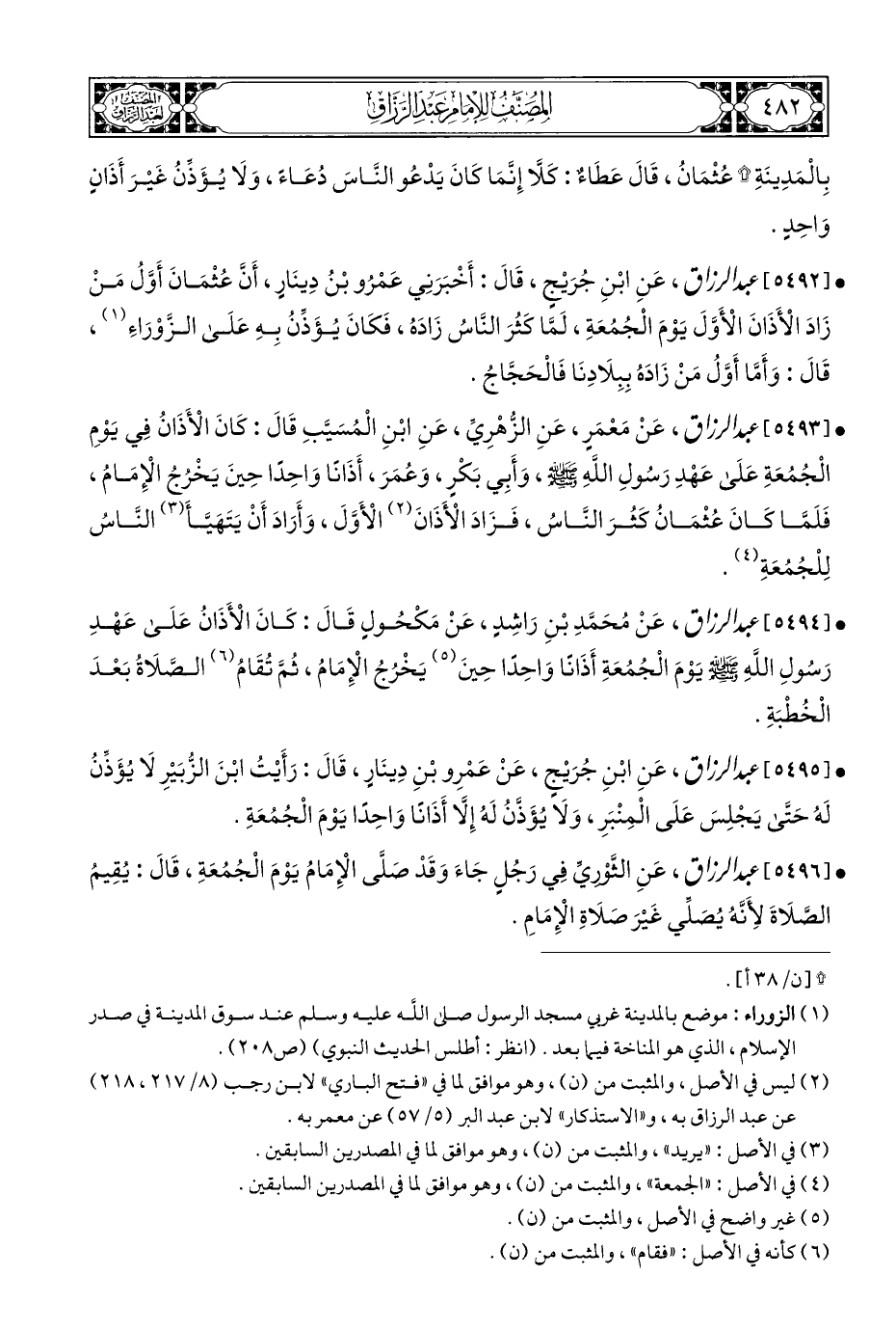 • [٥٤٩٢] عبد الرزاق، عَنِ ابْنِ جُرَيْجٍ، قَالَ: أَخْبَرَنِي عَمْرُو بْنُ دِينَارٍ، أَنَّ عُثْمَانَ أَوَّلُ مَنْ زَادَ الْأَذَانَ الْأَوَّلَ يَوْمَ الْجُمُعَةِ، لَمَّا كَثُرَ النَّاسُ زَادَهُ، فَكَانَ يُؤَذِّنُ بِهِ عَلَى الزَّوْرَاءَ (¬١)، قَالَ: وَأَمَّا أَوَّلُ مَنْ زَادَهُ بِبِلَادِنَا فَالْحَجَّاجُ.