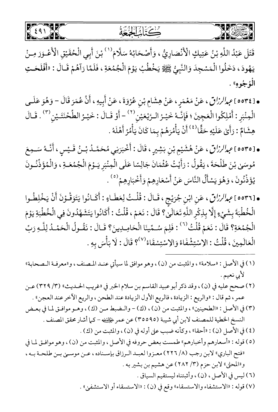 • [٥٥٣٥] عبد الرزاق، عَنْ هُشَيْمِ بْنِ بَشِيرٍ، قَالَ: أَخْبَرَنِي مُحَمَّدُ بْنُ قَيْسٍ، أَنَّهُ سَمِعَ مُوسَى بْنَ طَلْحَةَ، يَقُولُ: رَأَيْتُ عُثْمَانَ جَالِسًا عَلَى الْمِنْبَرِ يَوْمَ الْجُمُعَةِ، وَالْمُؤَذِّنُونَ يُؤَذِّنُونَ، وَهُوَ يَسْأَلُ النَّاسَ عَنْ أَسْعَارِهِمْ وَأخْبَارِهِمْ (¬٥).