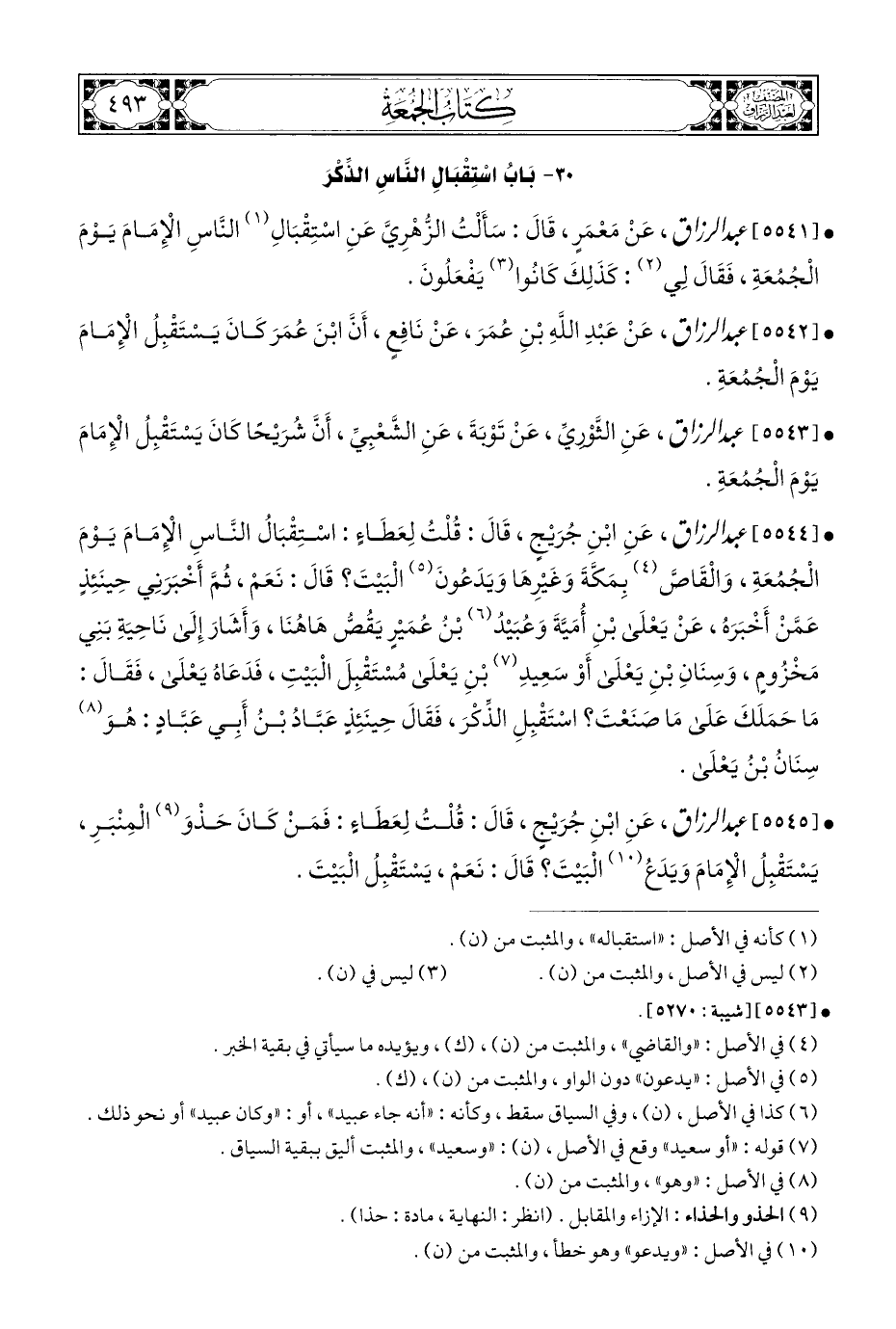 • [٥٥٤٤] عبد الرزاق، عَنِ ابْنِ جُرَيْجٍ، قَالَ: قُلْتُ لِعَطَاءٍ: اسْتِقْبَالُ النَّاسِ الْإِمَامَ يَوْمَ الْجُمُعَةِ، وَالْقَاصَّ (¬٤) بِمَكَةَ وَغَيْرِهَا وَيَدَعُونَ (¬٥) الْبَيْتَ؟ قَالَ: نَعَمْ، ثُمَّ أَخْبَرَنِي حِينَئِذٍ عَمَّنْ أَخْبَرَهُ، عَنْ يَعْلَى بْنِ أُمَيَّةَ وَعُبَيْدُ (¬٦) بْنُ عُمَيْرٍ يَقُصُّ هَاهُنَا، وَأَشَارَ إِلَي نَاحِيَةِ بَنِي مَخْزُومٍ، وَسِنَانِ بْنِ يَعْلَى أَوْ سَعِيدِ (¬٧) بْنِ يَعْلَى مُسْتَقْبِلَ الْبَيْتِ، فَدَعَاهُ يَعْلَى، فَقَالَ: مَا حَمَلَكَ عَلَى مَا صَنَعْتَ؟ اسْتَقْبِلِ الذِّكْرَ، فَقَالَ حِينَئِذٍ عَبَّادُ بْنُ أَبِي عَبَّادٍ: هُوَ (¬٨) سِنَانُ بْنُ يَعْلَى.