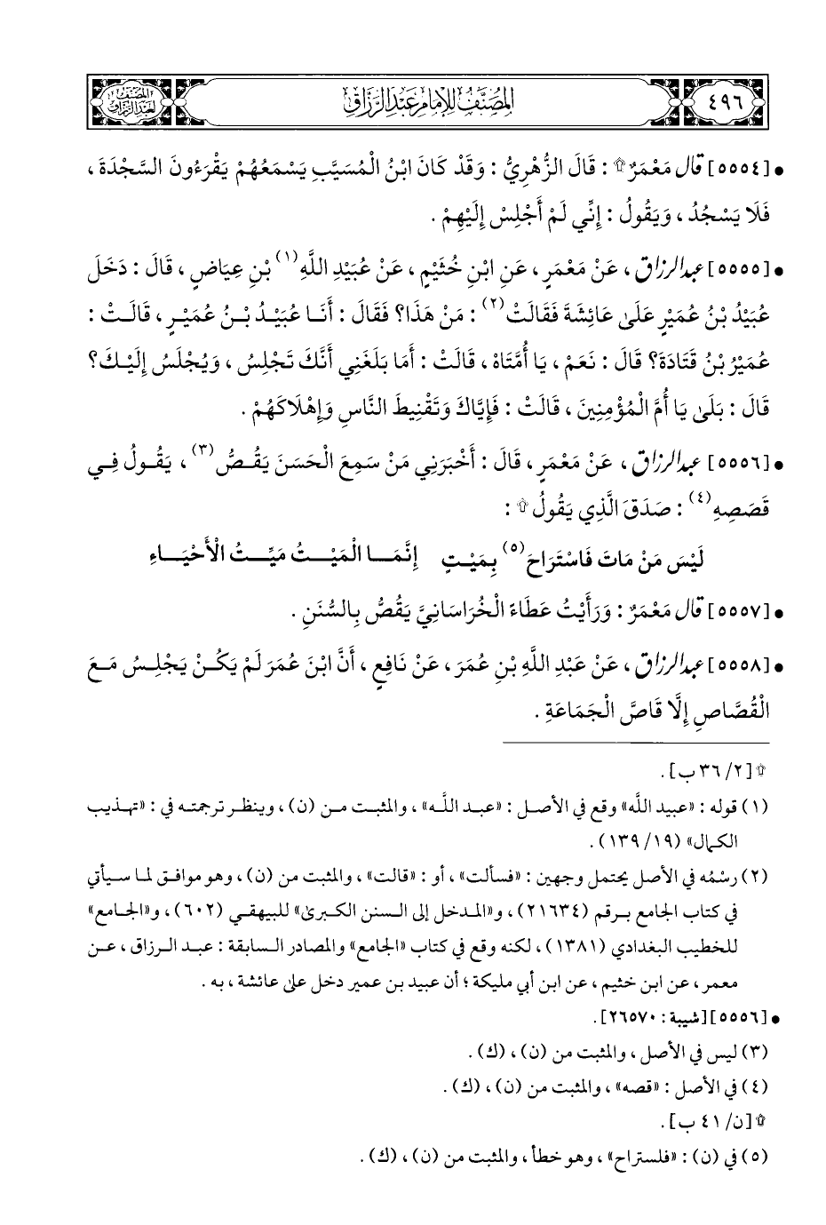 (¬٢) رسْمُه في الأصل يحتمل وجهين: "فسألت"، أو: "قالت"، والمثبت من (ن)، وهو موافق لما سيأتي في كتاب الجامع برقم (٢١٦٣٤)، و"المدخل إلى السنن الكبرى" للبيهقي (٦٠٢)، و"الجامع" للخطيب البغدادي (١٣٨١)، لكنه وقع في كتاب "الجامع" والمصادر السابقة: عبد الرزاق، عن معمر، عن ابن خثيم، عن ابن أبي مليكة؛ أن عبيد بن عمير دخل علي عائشة، به.