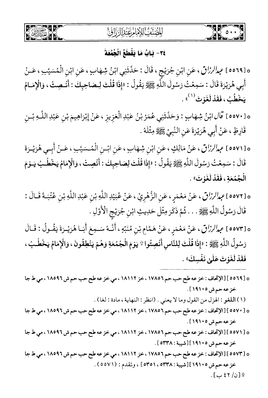 ° [٥٥٧١] عبد الرزاق، عَنْ مَالِكٍ، عَنِ ابْنِ شِهَابٍ، عَنِ ابْنِ الْمُسَيَّبِ، عَنْ أَبِي هُرَيْرَةَ قَالَ: سَمِعْتُ رَسُولَ اللَّهِ بها يَقُولُ: "إِذَا قُلْتَ لِصَاحِبِكَ: أَنْصِتْ، وَالْإِمَامُ يَخْطُبُ يَوْمَ الْجُمُعَةِ، فَقَدْ لَغَوْتَ".