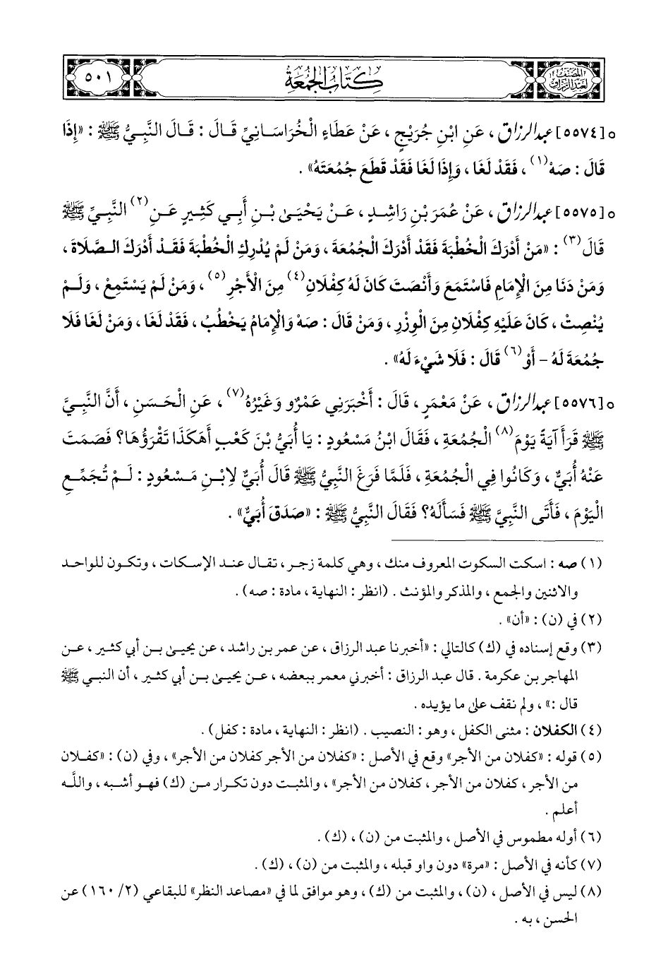 ° [٥٥٧٥] عبد الرزاق، عَنْ عُمَرَ بْنِ رَاشِدٍ، عَنْ يَحْيَى بْنِ أَبِي كَثِيرٍ عَنِ (¬٢) النَّبِيِّ - صلى الله عليه وسلم - قَالَ (¬٣): "مَنْ أَدْرَكَ الْخُطْبَةَ فَقَدْ أَدْرَكَ الْجُمُعَةَ، وَمَنْ لَمْ يُدْرِكِ الْخُطْبَةَ فَقَدْ أَدْرَكَ الصَّلَاةَ، وَمَنْ دَنَا مِنَ الْإِمَامِ فَاسْتَمَعَ وَأَنْصَتَ كَانَ لَهُ كِفْلَانِ (¬٤) مِنَ الْأَجْرِ (¬٥)، وَمَنْ لَم يَسْتَمِعْ، وَلَمْ يُنْصِتْ، كَانَ عَلَيْهِ كِفْلَانِ مِنَ الْوِزْرِ، وَمَنْ قَالَ: صَهْ وَالْإِمَامُ يَخْطُبُ، فَقَد لَغَا، وَمَنْ لَغَا فَلَا جُمُعَةَ لَهُ - أَوْ (¬٦) قَالَ: فَلَا شَيءَ لَهُ".