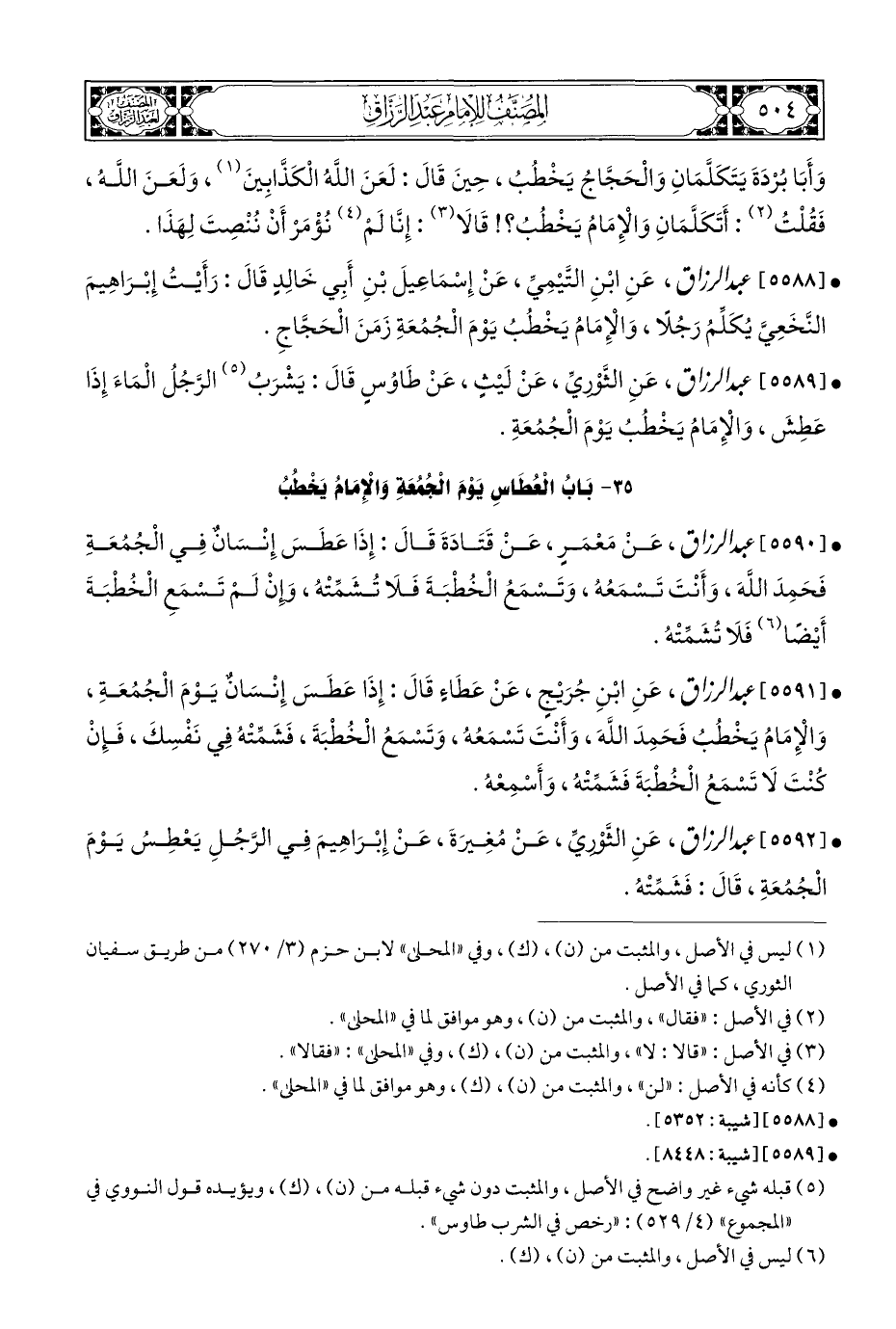 • [٥٥٩٠] عبد الرزاق، عَنْ مَعْمَرٍ، عَنْ قَتَادَةَ قَالَ: إِذَا عَطَسَ إِنْسَانٌ فِي الْجُمُعَةِ فَحَمِدَ اللَّهَ، وَأَنْتَ تَسْمَعُهُ، وَتَسْمَعُ الْخُطْبَةَ فَلَا تُشَمِّتْهُ، وإِنْ لَمْ تَسْمَعِ الْخُطْبَةَ أَيْضًا (¬٦) فَلَا تُشَمِّتْهُ.