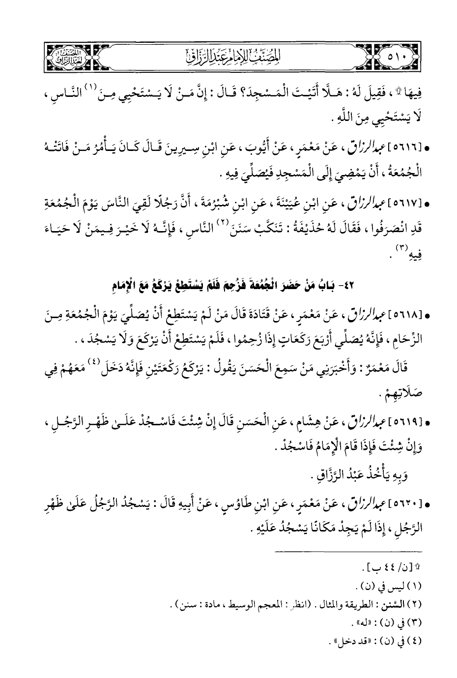 • [٥٦١٧] عبد الرزاق، عَنِ ابْنِ عُيَيْنَةَ، عَنِ ابْنِ شُبْرُمَةَ، أَنَّ رَجُلًا لَقِيَ النَّاسَ يَوْمَ الْجُمُعَةِ قَدِ انْصرَفُوا، فَقَالَ لَهُ حُذَيْفَةُ: تَنَكَّبْ سَنَنَ (¬٢) النَّاسِ، فَإِنَّهُ لَا خَيْرَ فِيمَنْ لَا حَيَاءَ فِيهِ (¬٣).