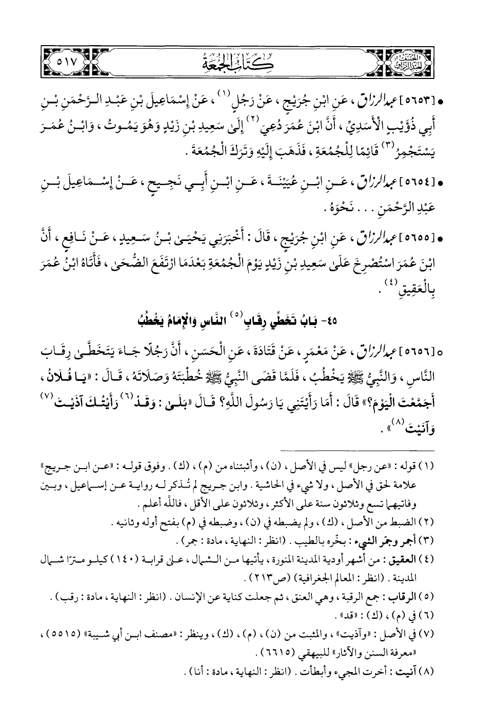 (¬٤) العقيق: من أشهر أودية المدينة المنورة، يأتيها من الشمال، على قرابة (١٤٠) كيلومترًا شمال المدينة. (انظر: المعالم الجغرافية) (ص ٢١٣).