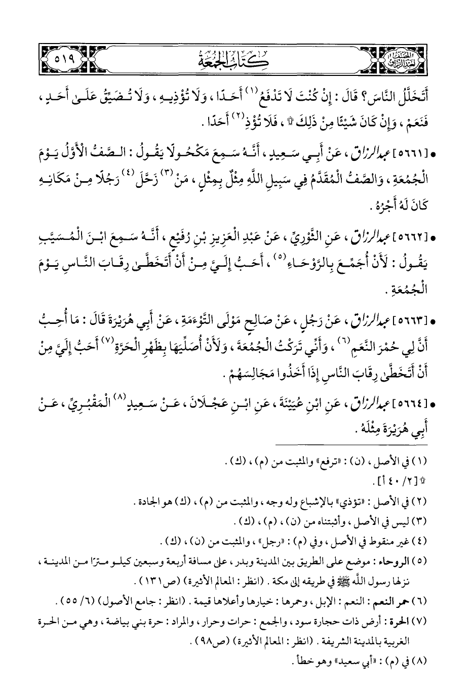 • [٥٦٦٣] عبد الرزاق، عَنْ رَجُلٍ، عَنْ صَالِحٍ مَوْلَى التَّوْءَمَةِ، عَنْ أَبِي هُرَيْرَهَ قَالَ: مَا أُحِبُّ أَنَّ لِي حُمْرَ النَّعَمِ (¬٦)، وَأَنِّي تَرَكْتُ الْجُمُعَةَ، وَلأَنْ أُصَلِّيَهَا بِظَهْرِ الْحَرَّةِ (¬٧) أَحَبُّ إِلَيَّ مِنْ أَنْ أَتَخَطَّى رِقَابَ النَّاسِ إِذَا أَخَذُوا مَجَالِسَهُمْ.