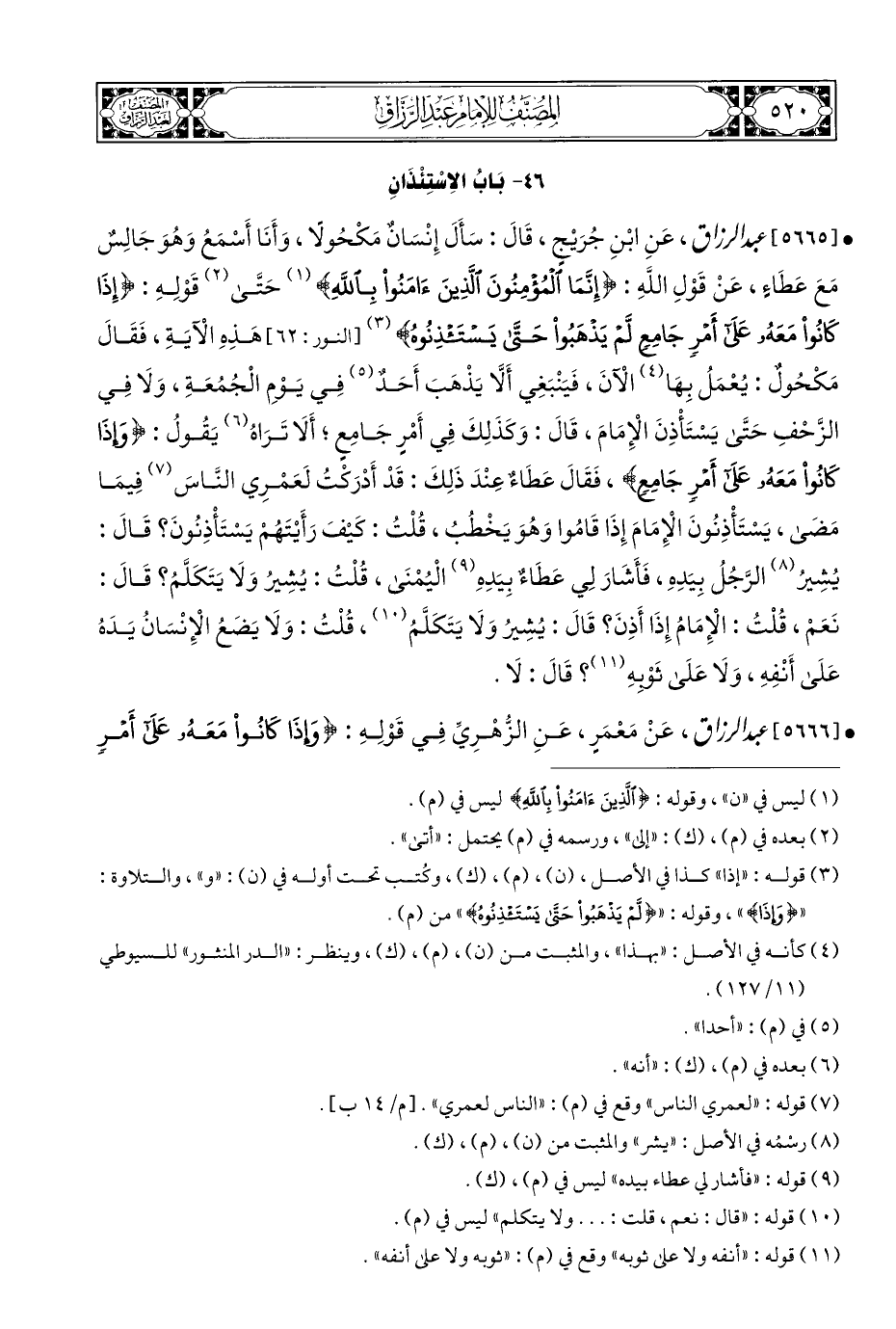• [٥٦٦٥] عبد الرزاق، عَنِ ابْنِ جُرَيْجٍ، قَالَ: سَأَلَ إِنْسَانٌ مَكْحُولًا، وَأَنَا أَسْمَعُ وَهُوَ جَالِسٌ مَعَ عَطَاءٍ، عَنْ قَوْلِ اللَّهِ: {إِنَّمَا الْمُؤْمِنُونَ الَّذِينَ آمَنُوا بِاللَّهِ} (¬١) حَتَّى (¬٢) قَوْلِهِ: {وَإِذَا كَانُوا مَعَهُ عَلَى أَمْرٍ جَامِعٍ لَمْ يَذْهَبُوا حَتَّى يَسْتَأْذِنُوهُ} (¬٣) [النور: ٦٢] هَذِهِ الْآيَةِ، فَقَالَ مَكْحُولٌ: يُعْمَلُ بِهَا (¬٤) الْآنَ، فَيَنْبَغِي أَلَّا يَذْهَبَ أَحَدٌ (¬٥) فِي يَوْمِ الْجُمُعَةِ، وَلَا فِي الزَّحْفِ حَتَّى يَسْتَأْذِنَ الْإِمَامَ، قَالَ: وَكَذَلِكَ فِي أَمْرٍ جَامِعٍ؟ أَلَا تَرَاهُ (¬٦) يَقُولُ: {وَإِذَا كَانُوا مَعَهُ عَلَى أَمْرٍ جَامِعٍ}، فَقَالَ عَطَاءٌ عِنْدَ ذَلِكَ: قَدْ أَدْرَكْتُ لَعَمْرِي النَّاسَ (¬٧) فِيمَا مَضَى، يَسْتَأْذِنُونَ الْإِمَامَ إِذَا قَامُوا وَهُوَ يَخْطُبُ، قُلْتُ: كَيْفَ رَأَيْتَهُمْ يَسْتَأْذِنُونَ؟ قَالَ: يُشِيرُ (¬٨) الرَّجُلُ بِيَدِهِ، فَأَشَارَ لِي عَطَاءٌ بِيَدِهِ (¬٩) الْيُمْنَى، قُلْتُ: يُشِيرُ وَلَا يَتَكَلَّمُ؟ قَالَ: نَعَمْ، قُلْتُ: الْإِمَامُ إِذَا أَذِنَ؟ قَالَ: يُشِيرُ وَلَا يَتَكَلَّمُ (¬١٠)، قُلْتُ: وَلَا يَضَعُ الْإِنْسَانُ يَدَهُ عَلَى أَنْفِهِ، وَلَا عَلَى ثَوْبِهِ (¬١١)؟ قَالَ: لَا.