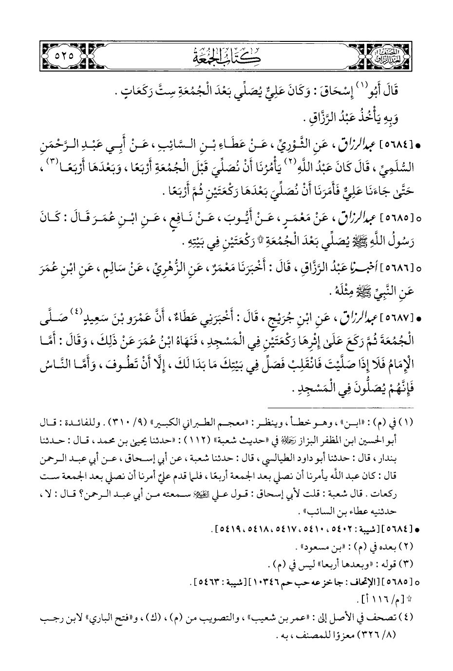 (¬١) في (م): "ابن"، وهو خطأ، وينظر: "معجم الطبراني الكبير" (٩/ ٣١٠). وللفائدة: قال أبو الحسين بن الظفر البزاز رحمه الله في "حديث شعبة" (١١٢): "حدثنا يحيى بن محمد، قال: حدثنا بندار، قال: حدثنا أبو داود الطيالسي، قال: حدثنا شعبة، عن أبي إسحاق، عن أي عبد الرحمن قال: كان عبد الله يأمرنا أن نصلي بعد الجمعة أربعًا، فلما قدم في أمرنا أن نصلي بعد الجمعة ست ركعات. قال شعبة: قلت لأبي إسحاق: قول علي السنة سمعته من أبي عبد الرحمن؟ قال: لا، حدثنيه عطاء بن السائب".