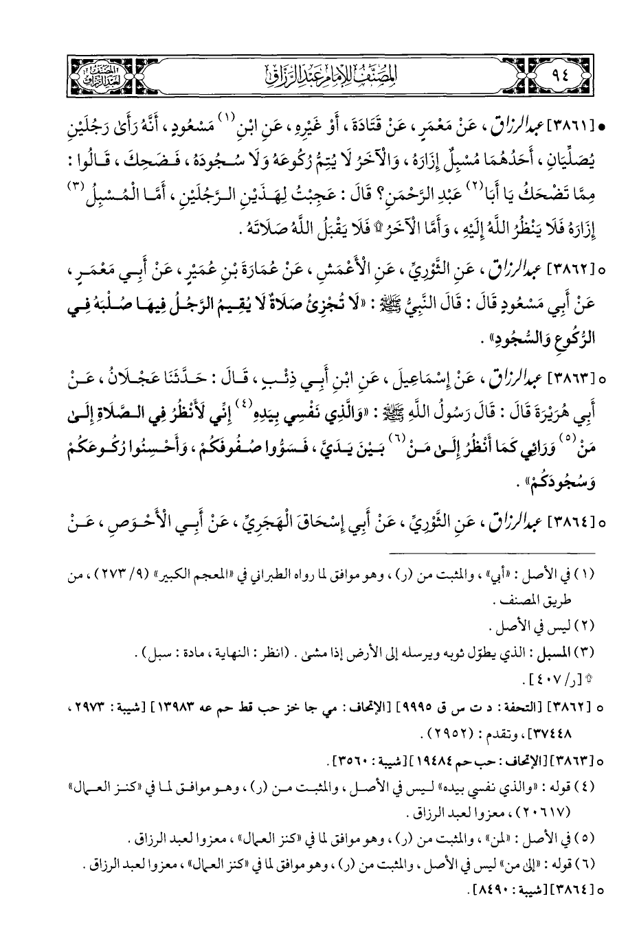 ° [٣٨٦٢] عبد الرزاق، عَنِ الثَّوْرِيِّ، عَنِ الْأَعْمَشِ، عَنْ عُمَارَةَ بْنِ عُمَيْرٍ، عَنْ أَبِي مَعْمَرٍ، عَنْ أَبِي مَسْعُودٍ قَالَ: قَالَ النَّبِيُّ - صلى الله عليه وسلم -:"لَا تُجْزِئُ صَلَاةٌ لَا يُقِيمُ الرَّجُلُ فِيهَا صُلْبَهُ فِي الرُّكُوعِ وَالسُّجُودِ".
