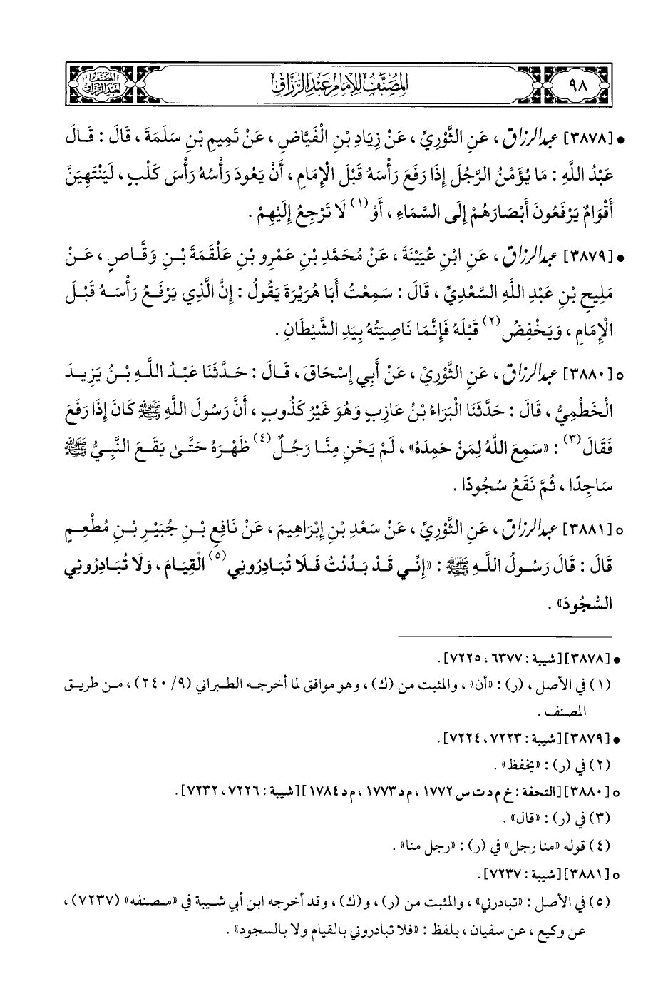 • [٣٨٧٩] عبد الرزاق، عَنِ ابْنِ عُيَيْنَةَ، عَنْ مُحَمَّدِ بْنِ عَمْرِو بْنِ عَلْقَمَةَ بْنِ وَقَّاصٍ، عَنْ مَلِيحِ بْنِ عَبْدِ اللَّهِ السَّعْدِيِّ، قَالَ: سَمِعْتُ أَبَا هُرَيْرَةَ يَقُولُ: إِنَّ الَّذِي يَرْفَعُ رَأْسَهُ قَبْلَ الْإِمَامِ، وَيَخْفِضُ (¬٢) قَبْلَهُ فَإِنَّمَا نَاصيَتُهُ بِيَدِ الشَّيْطَانِ.