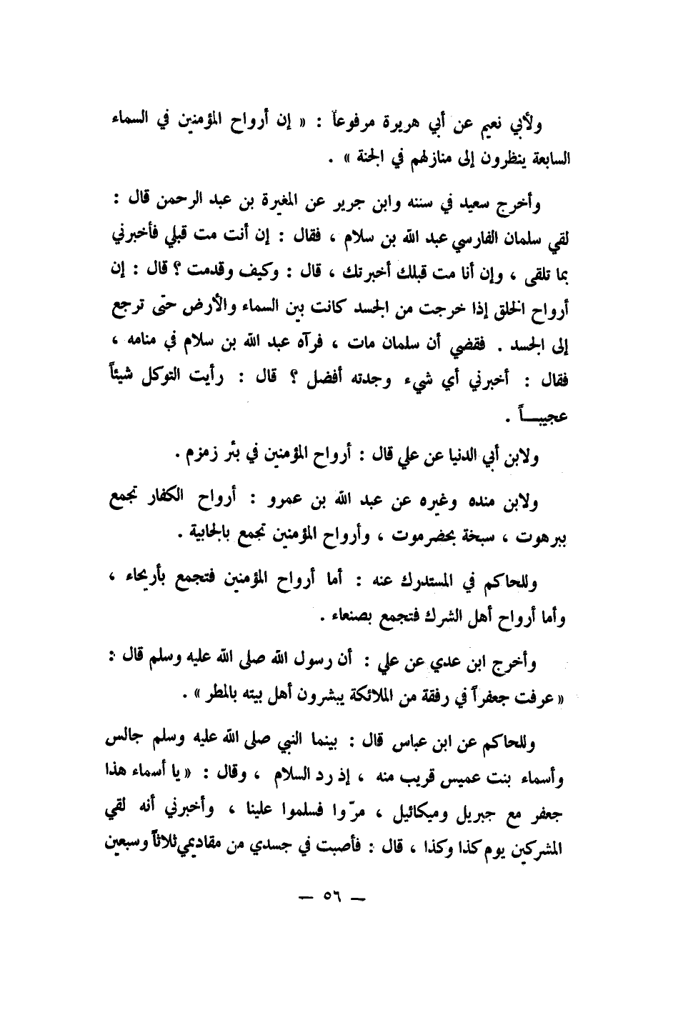 وأخرج سعيد في سننه وابن جرير عن المغيرة بن عبد الرحمن قال: "لقي سلمان الفارسي عبد الله بن سلام، فقال: إن أنت مت قبلي فأخبرني بما تلقى، وإن أنا مت قبلك أخبرتك، قال: وكيف وقد مت؟ قال: إن أرواح الخلق إذا خرجت من الجسد كانت بين السماء والأرض حتى ترجع إلى الجسد. فقضي أن سلمان مات، فرآه عبد الله بن سلام في منامه، فقال: أخبرني أي شيء وجدته أفضل؟ قال: رأيت التوكل شيئا عجيبا".