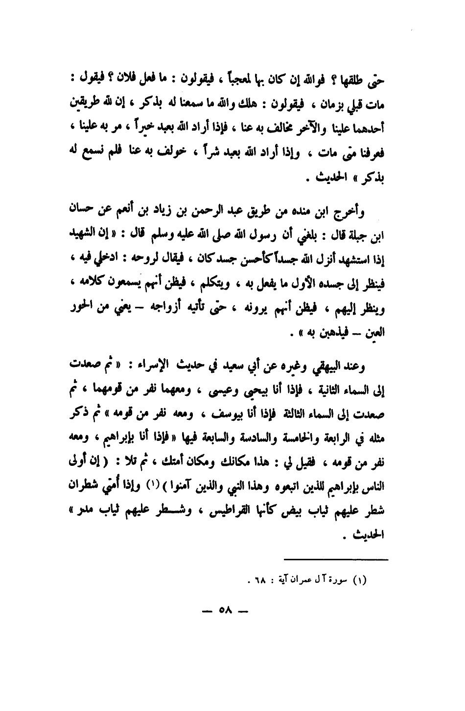 ثم ذكر مثله في الرابعة والخامسة والسادسة والسابعة فيها: "فإذا أنا بإبراهيم، ومعه نفر من قومه، فقيل لي: هذا مكانك ومكان أمتك، ثم تلا: {إِنَّ أَوْلَى النَّاسِ بِإِبْرَاهِيمَ لَلَّذِينَ اتَّبَعُوهُ وَهَذَا النَّبِيُّ وَالَّذِينَ آمَنُوا} 1 وإذا أمتي شطران شطر عليهم ثياب بيض كأنها القراطيس، وشطر عليهم ثياب مدر" الحديث.