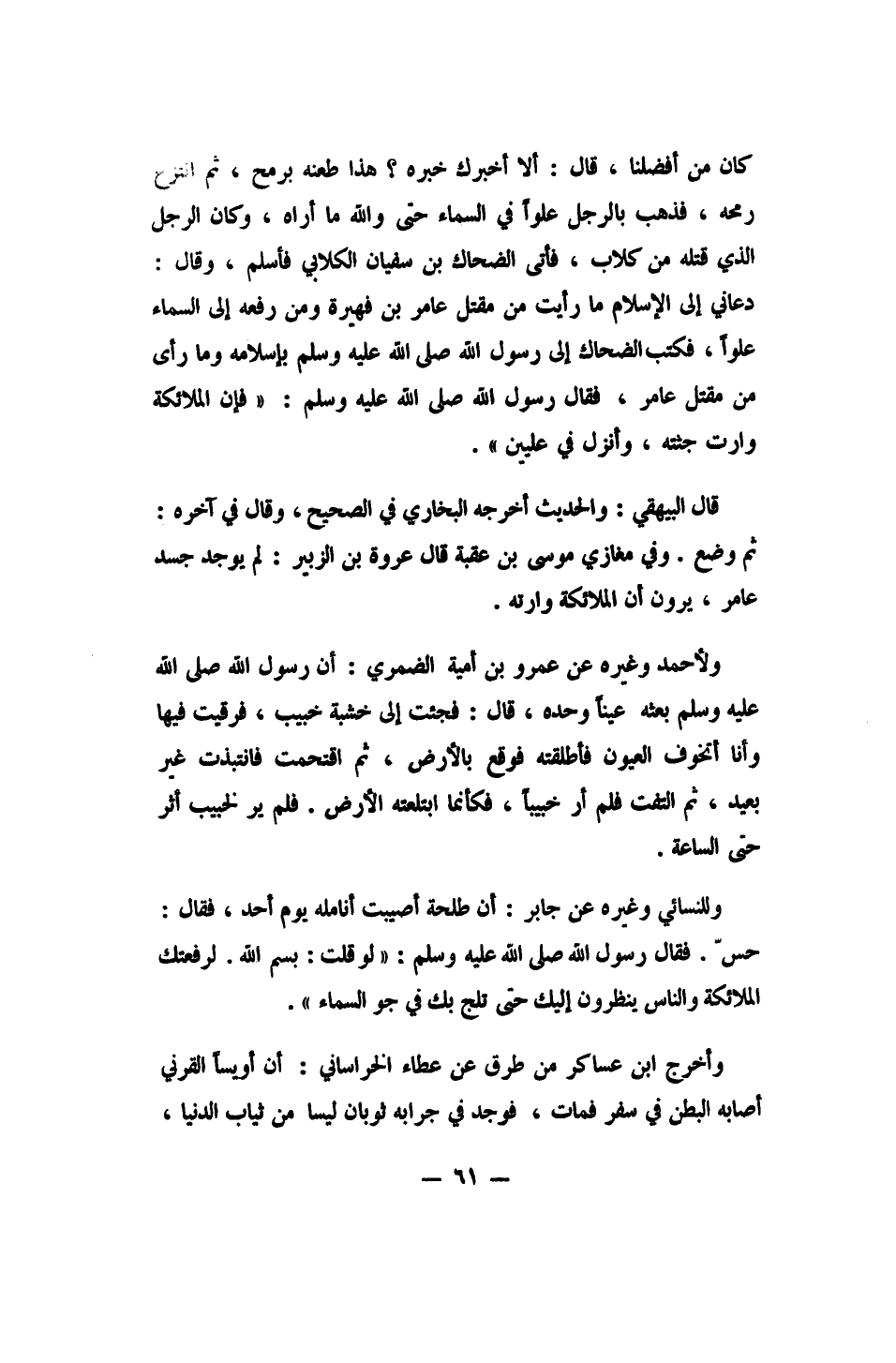 كان من أفضلنا، قال: ألا أخبرك خبره؟ هذا طعنه برمح، ثم انتزع رمحه، فذهب بالرجل علوا في السماء حتى والله ما أراه، وكان الرجل الذي قتله من كلاب، فأتى الضحاك بن سفيان الكلابي فأسلم، وقال: دعاني إلى الإسلام ما رأيت من مقتل عامر بن فهيرة ومن رفعه إلى السماء علوا، فكتب الضحاك إلى رسول الله صلى الله عليه وسلم بإسلامه وما رأى من مقتل عامر، فقال رسول الله صلى الله عليه وسلم فإن الملائكة وارت جثته، وأنزل في عليين".