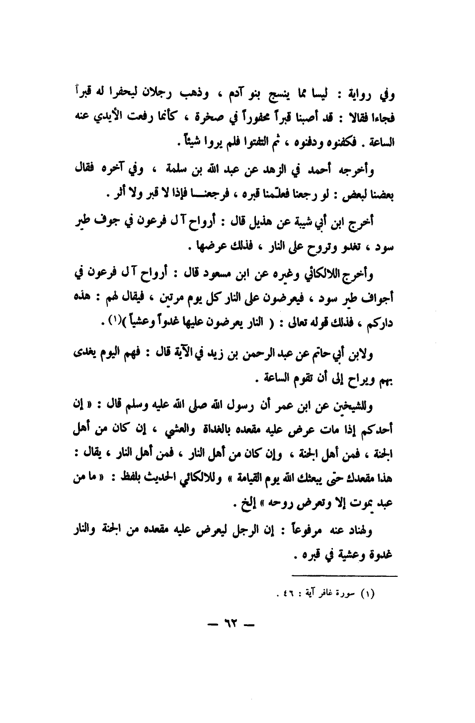 وأخرج اللالكائي وغيره عن ابن مسعود قال: "أرواح آل فرعون في أجواف طير سود، فيعرضون على النار كل يوم مرتين، فيقال لهم: هذه داركم، فذلك قوله تعالى: {النَّارُ يُعْرَضُونَ عَلَيْهَا غُدُوّاً وَعَشِيّاً} 1".